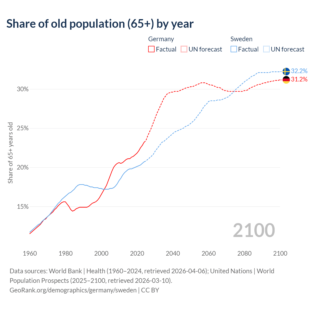 The share of older people aged 65 and over is 23.2% in Germany and 20.7% in Sweden. Life expectancy in Germany compared to Sweden .