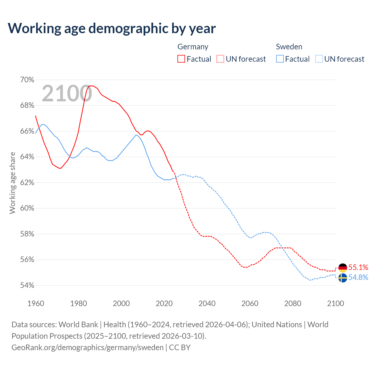 - Germany has 51.9M working age adults (aged 15-64) vs 6.65M in Sweden.