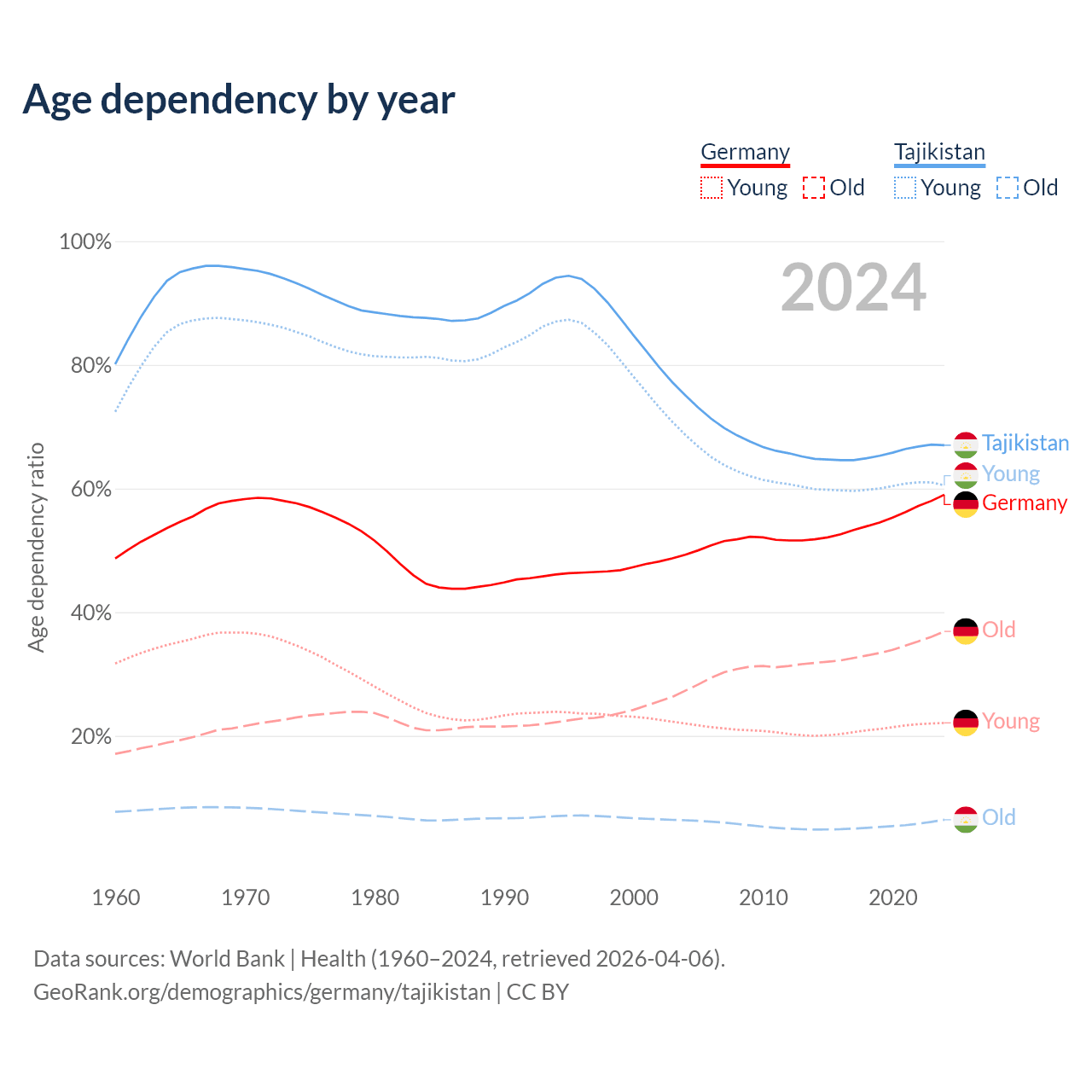 - Germany is ranked 9/196 by median age (oldest to youngest) vs 142/196 for Tajikistan.