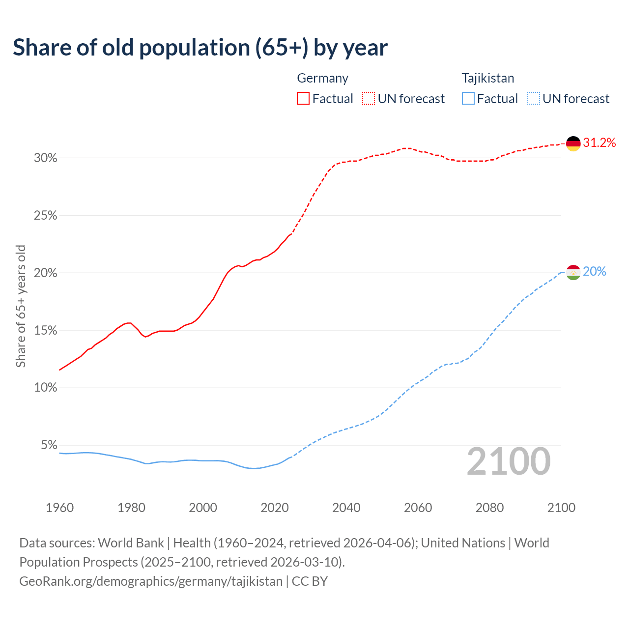 The share of older people aged 65 and over is 23.2% in Germany and 3.85% in Tajikistan. Life expectancy in Germany compared to Tajikistan .