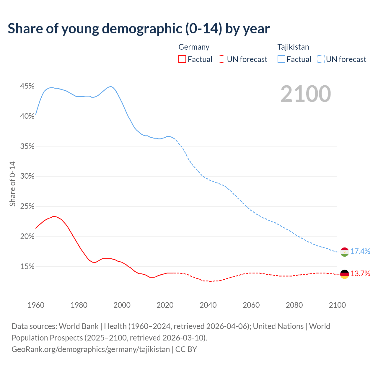 - The share of young demographic (0-15 years old) in Germany is 13.9% vs 36.3% in Tajikistan.