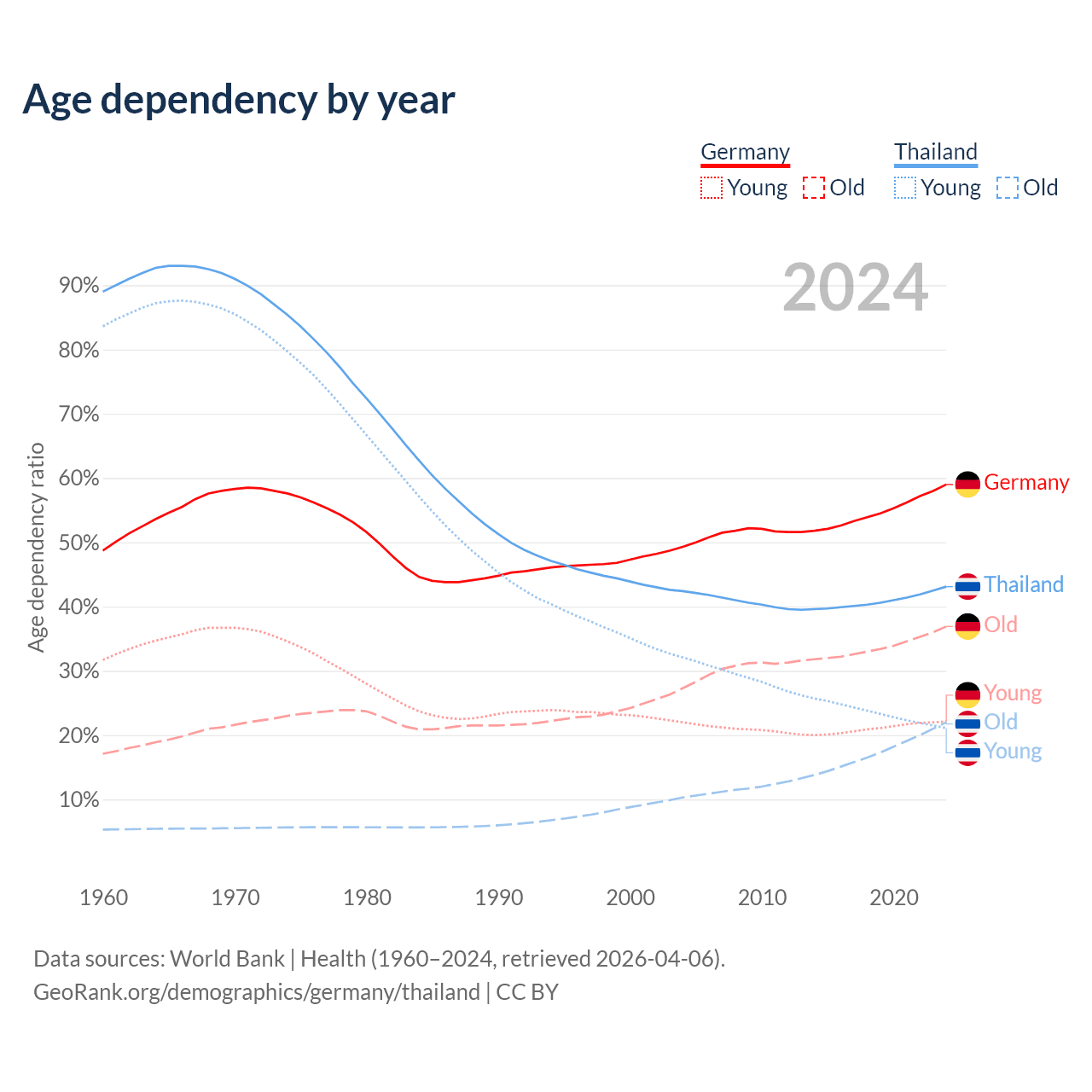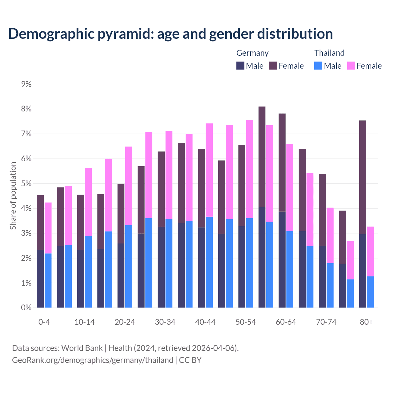- Germany is ranked 9/196 by median age (oldest to youngest) vs 40/196 for Thailand.