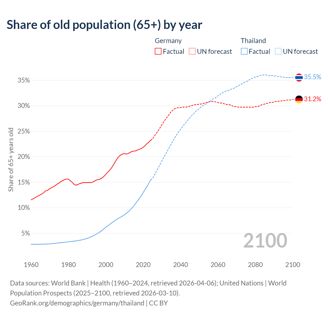 Median age Germany vs Thailand, 1960-2100