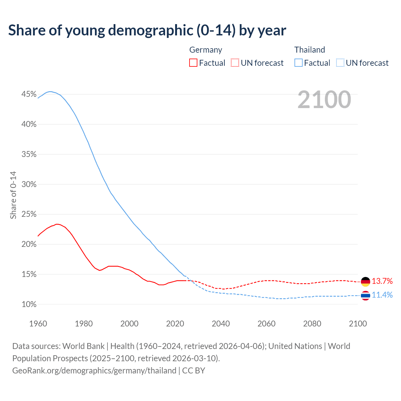 - The share of young demographic (0-15 years old) in Germany is 13.9% vs 14.7% in Thailand.