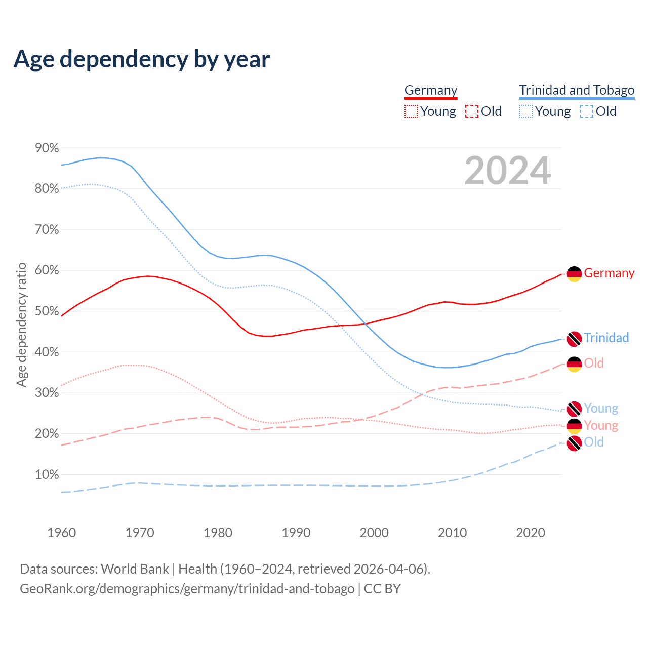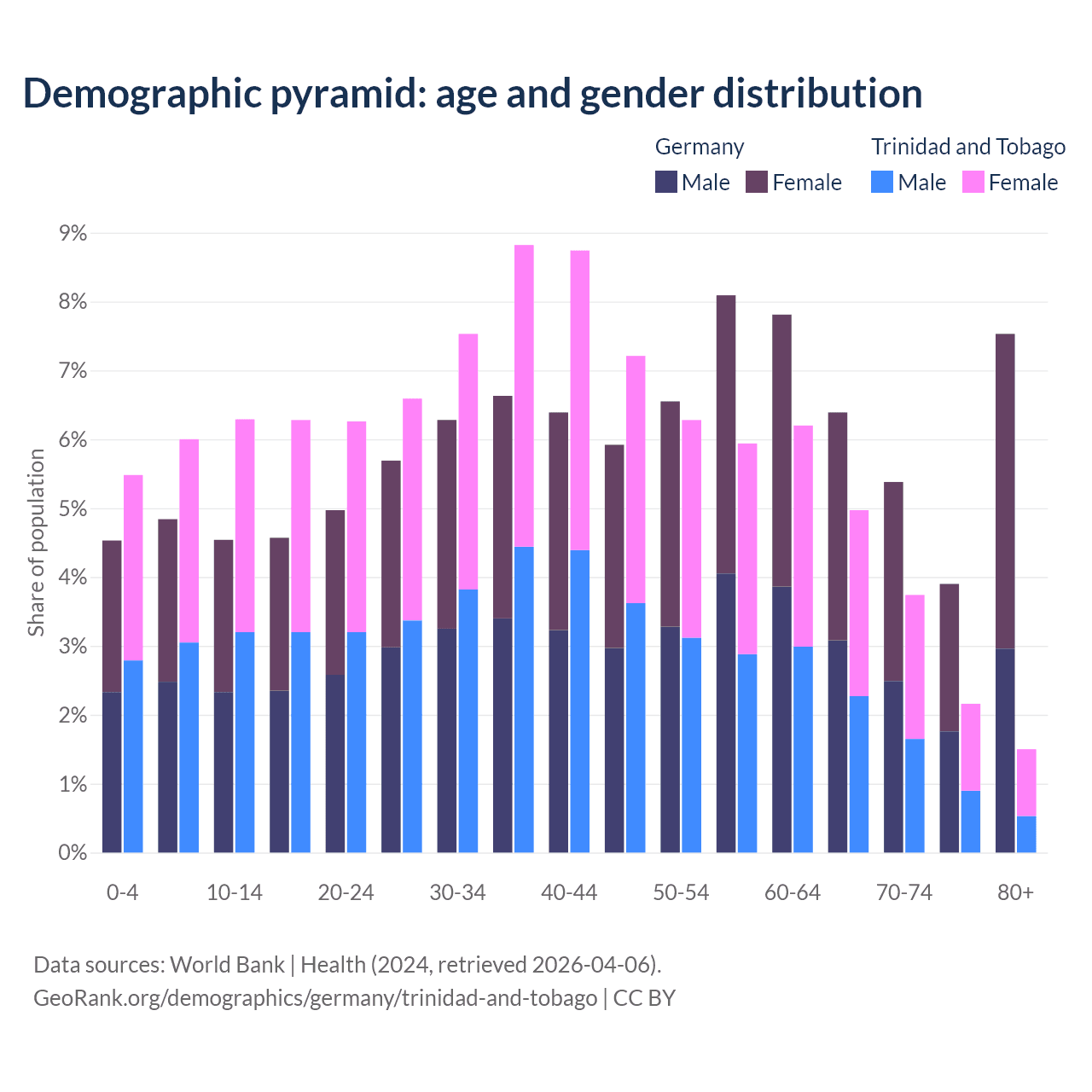 - Germany is ranked 9/196 by median age (oldest to youngest) vs 58/196 for Trinidad and Tobago.