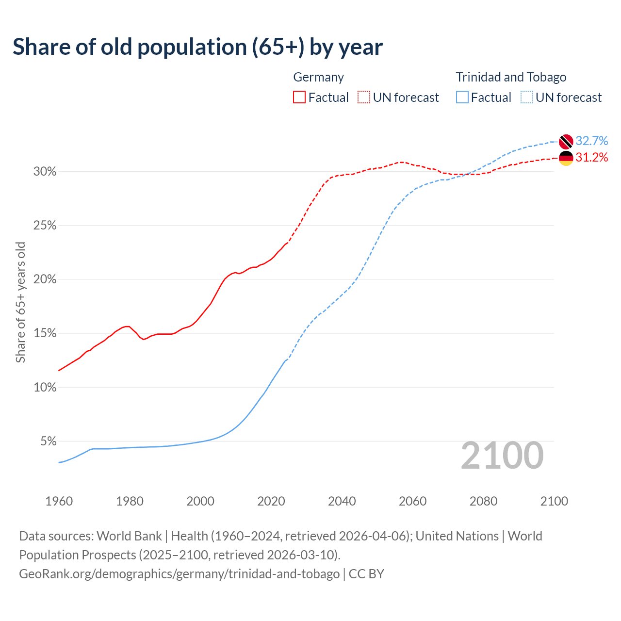 The share of older people aged 65 and over is 23.2% in Germany and 12.4% in Trinidad and Tobago. Life expectancy in Germany compared to Trinidad and Tobago .
