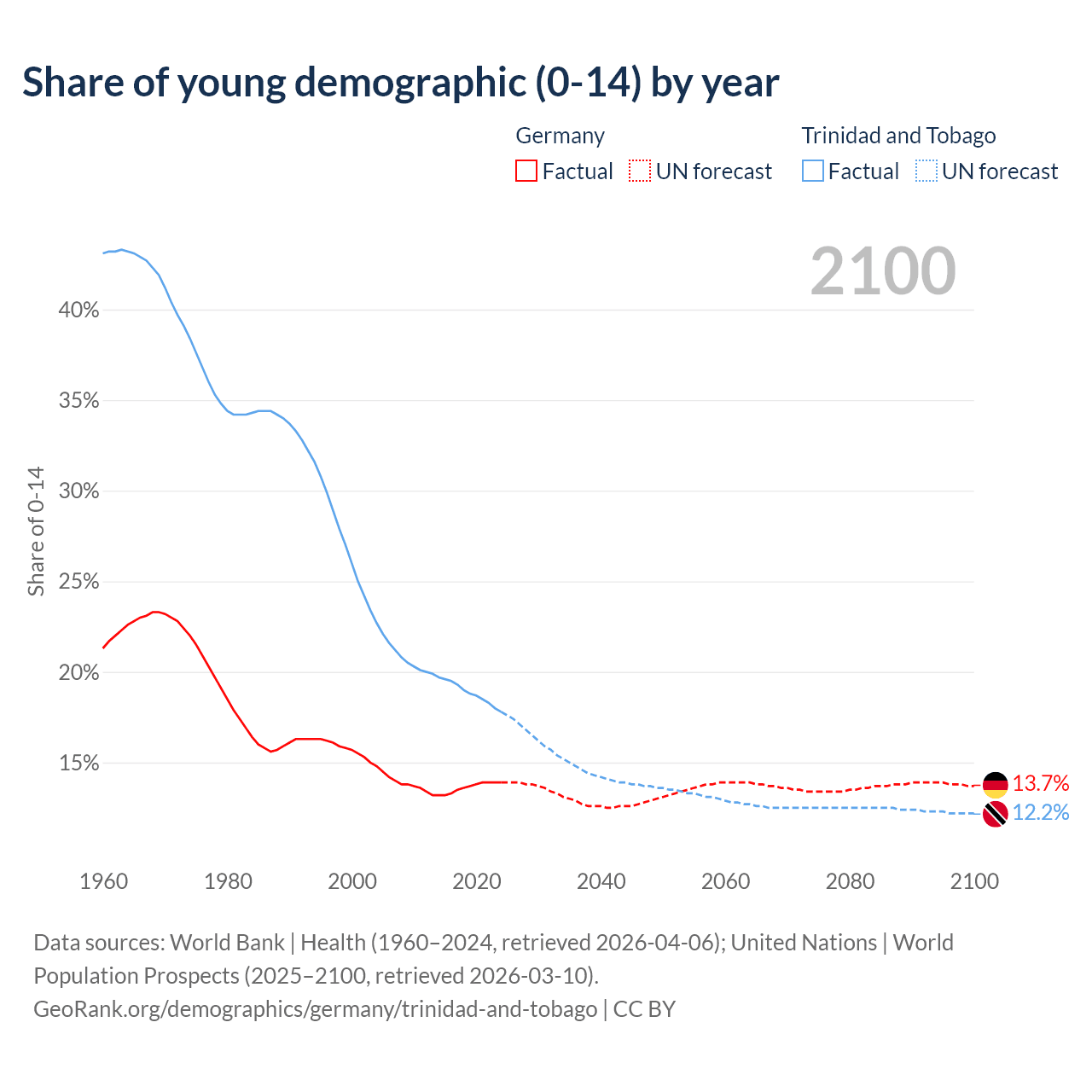 - The share of young demographic (0-15 years old) in Germany is 13.9% vs 17.8% in Trinidad and Tobago.
