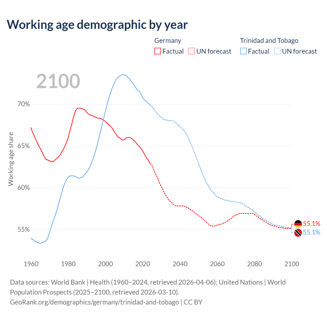 - Germany has 51.9M working age adults (aged 15-64) vs 960K in Trinidad and Tobago.