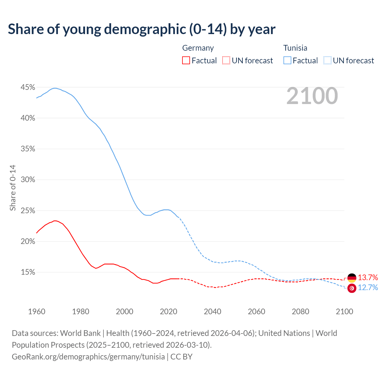 - The share of young demographic (0-15 years old) in Germany is 13.9% vs 24% in Tunisia.