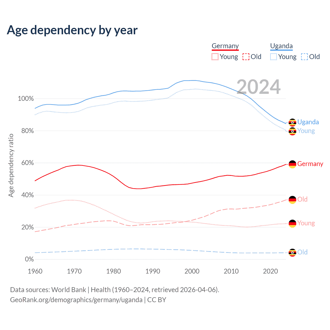 - Germany is ranked 9/196 by median age (oldest to youngest) vs 187/196 for Uganda.