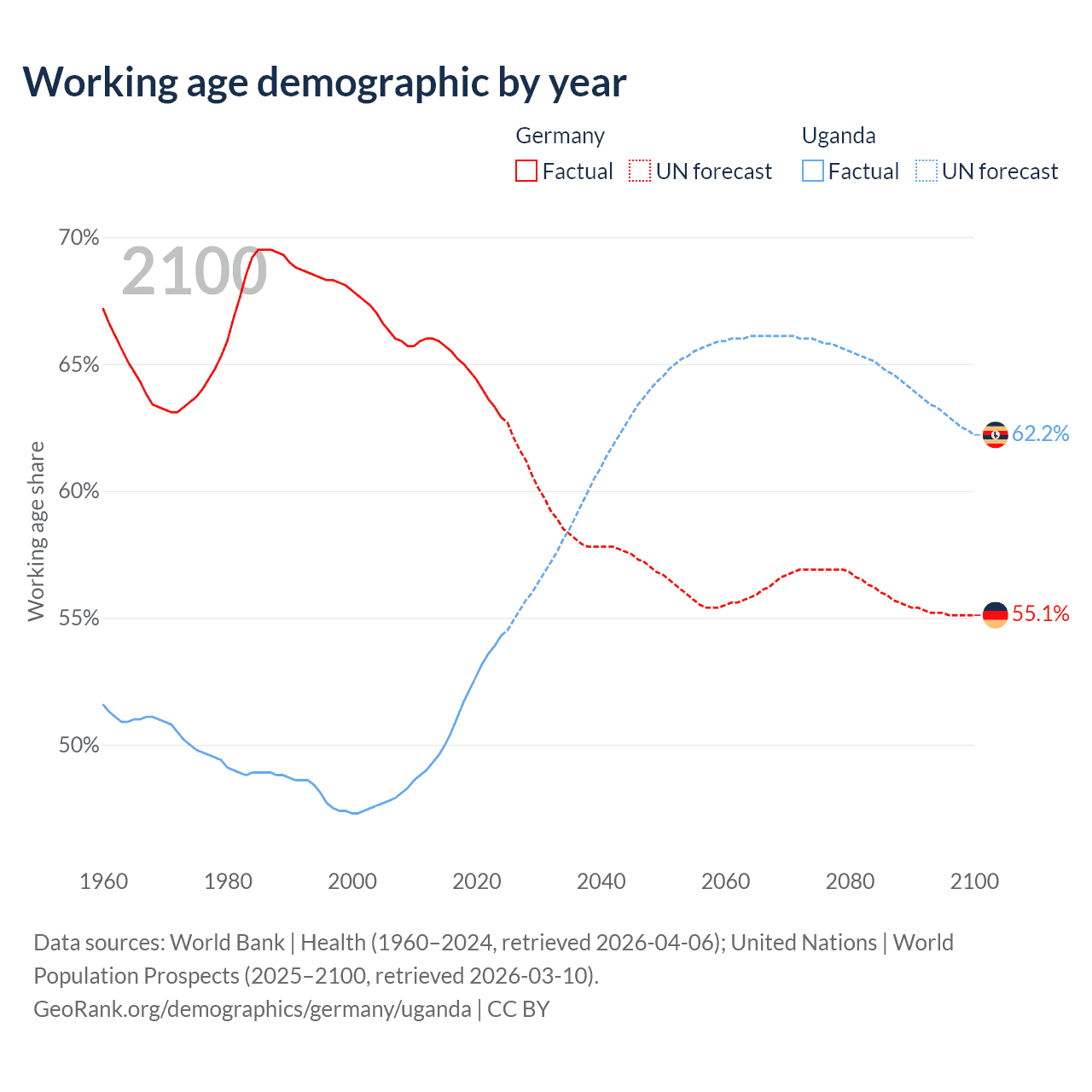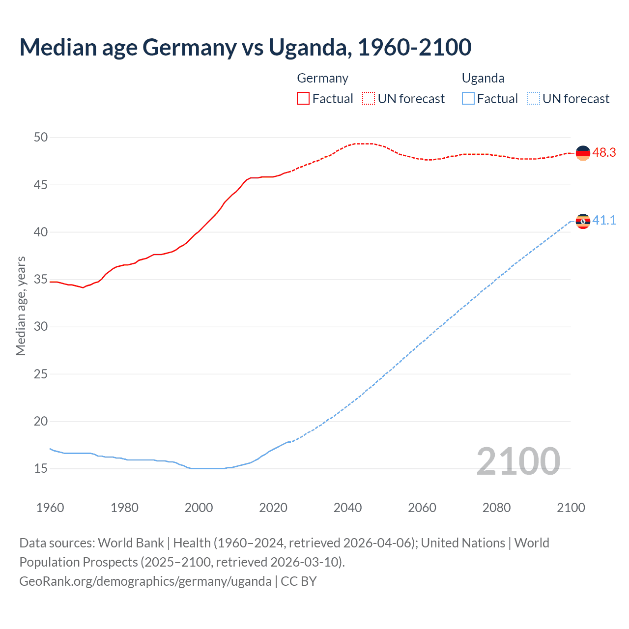 Median age Germany vs Uganda, 1960-2100