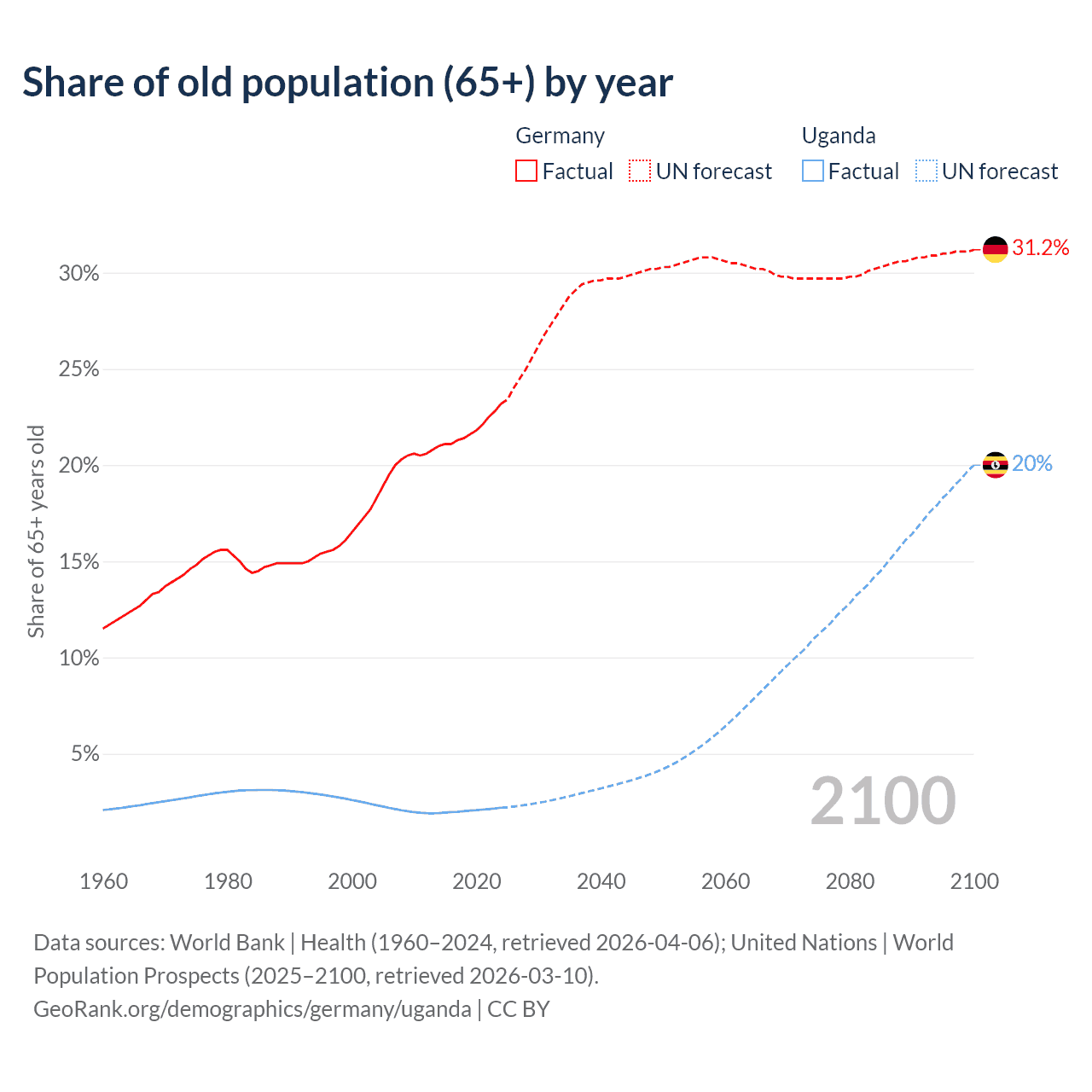 The share of older people aged 65 and over is 23.2% in Germany and 2.19% in Uganda. Life expectancy in Germany compared to Uganda .