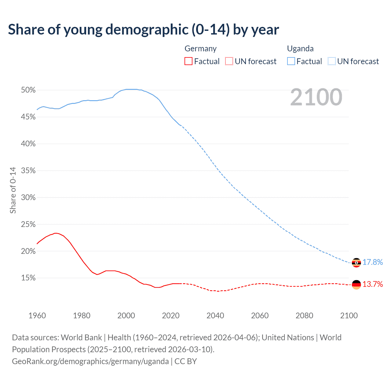- The share of young demographic (0-15 years old) in Germany is 13.9% vs 43.5% in Uganda.