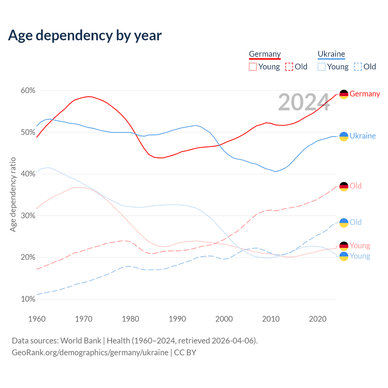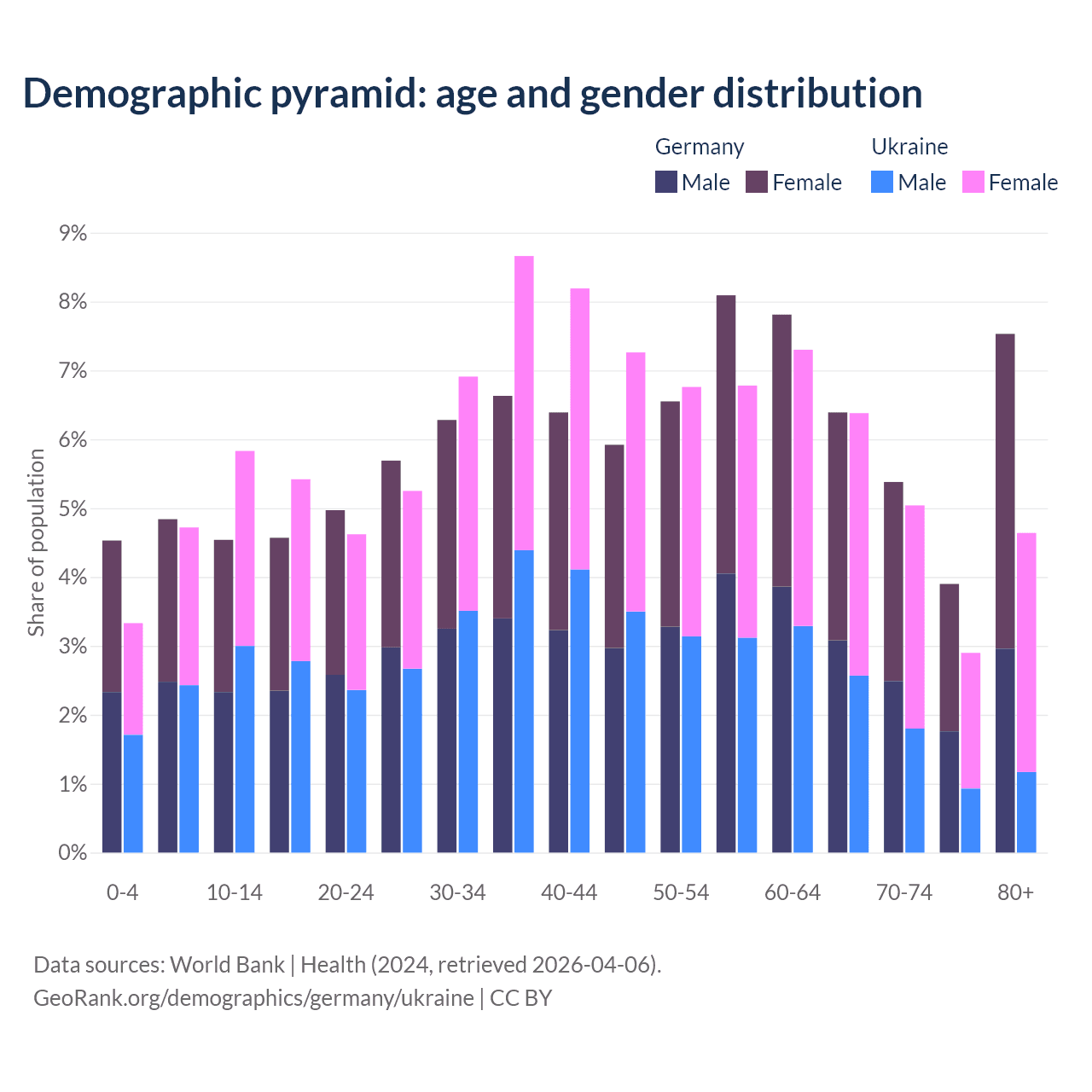 - Germany is ranked 9/196 by median age (oldest to youngest) vs 26/196 for Ukraine.