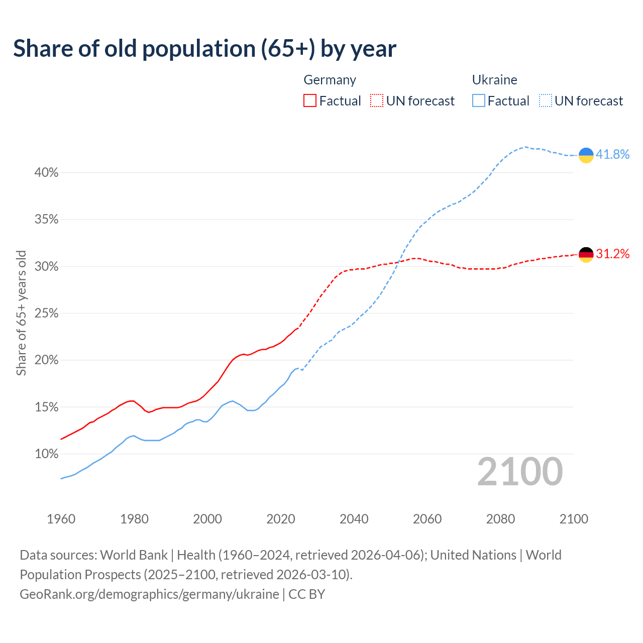 The share of older people aged 65 and over is 23.2% in Germany and 19% in Ukraine. Life expectancy in Germany compared to Ukraine .