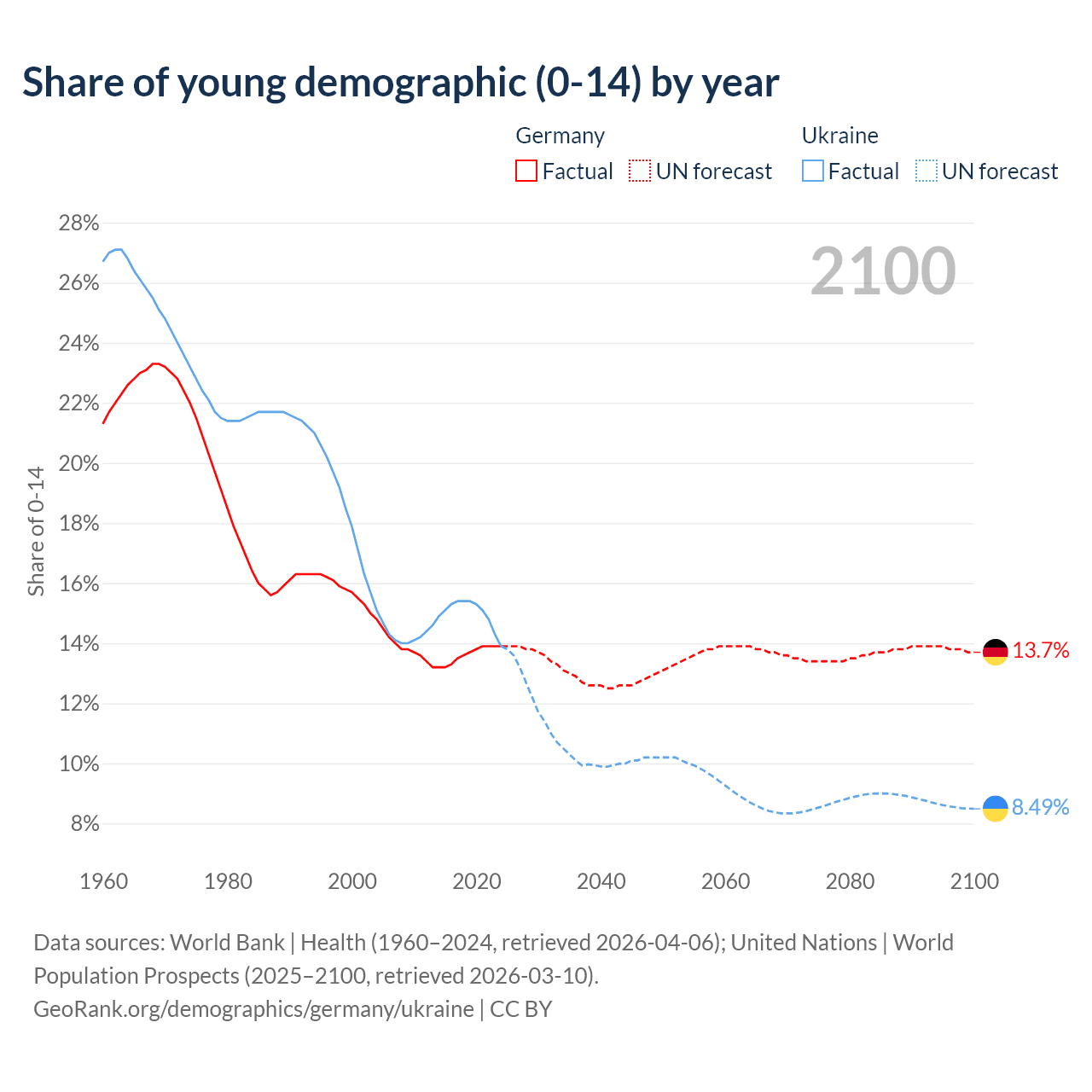- The share of young demographic (0-15 years old) in Germany is 13.9% vs 13.9% in Ukraine.