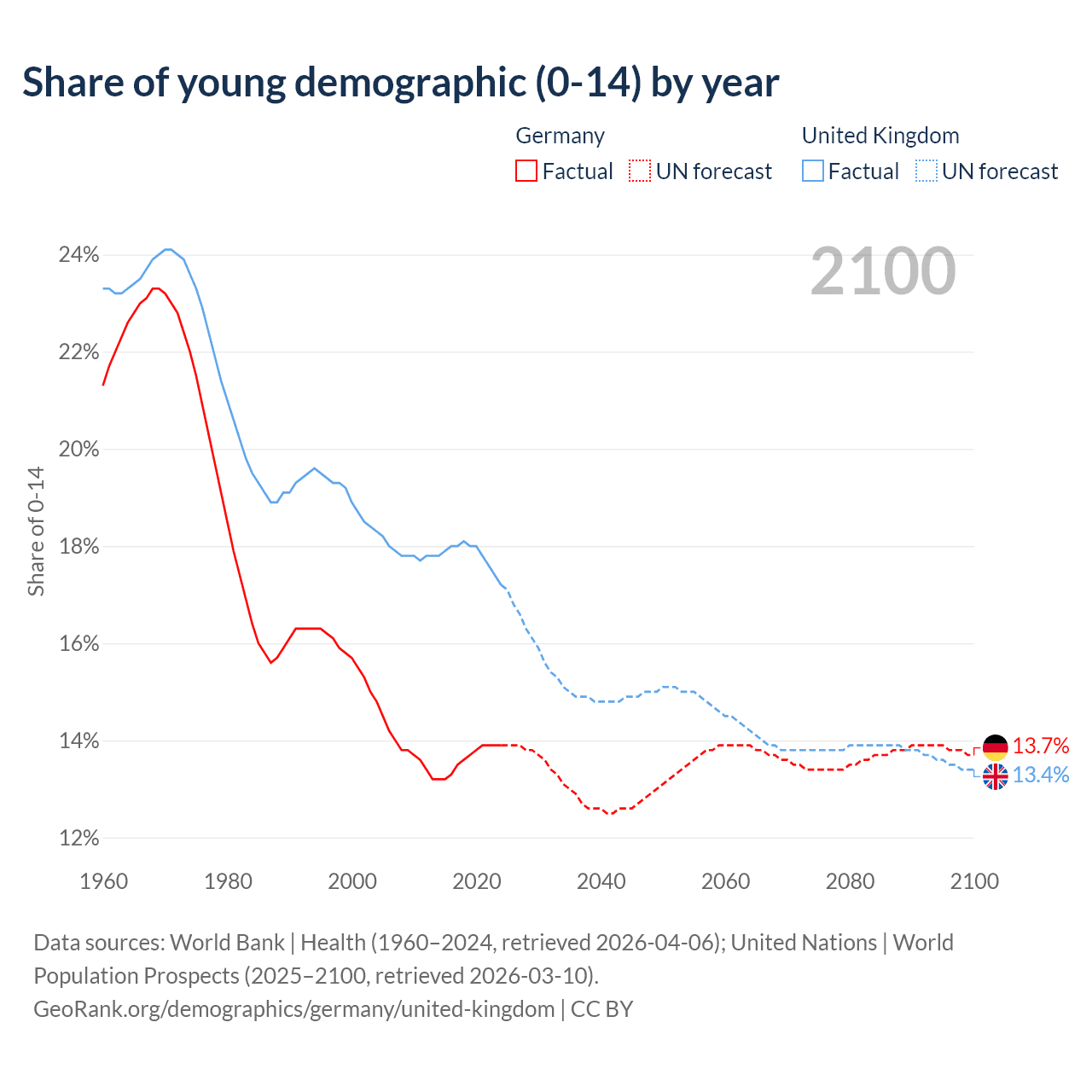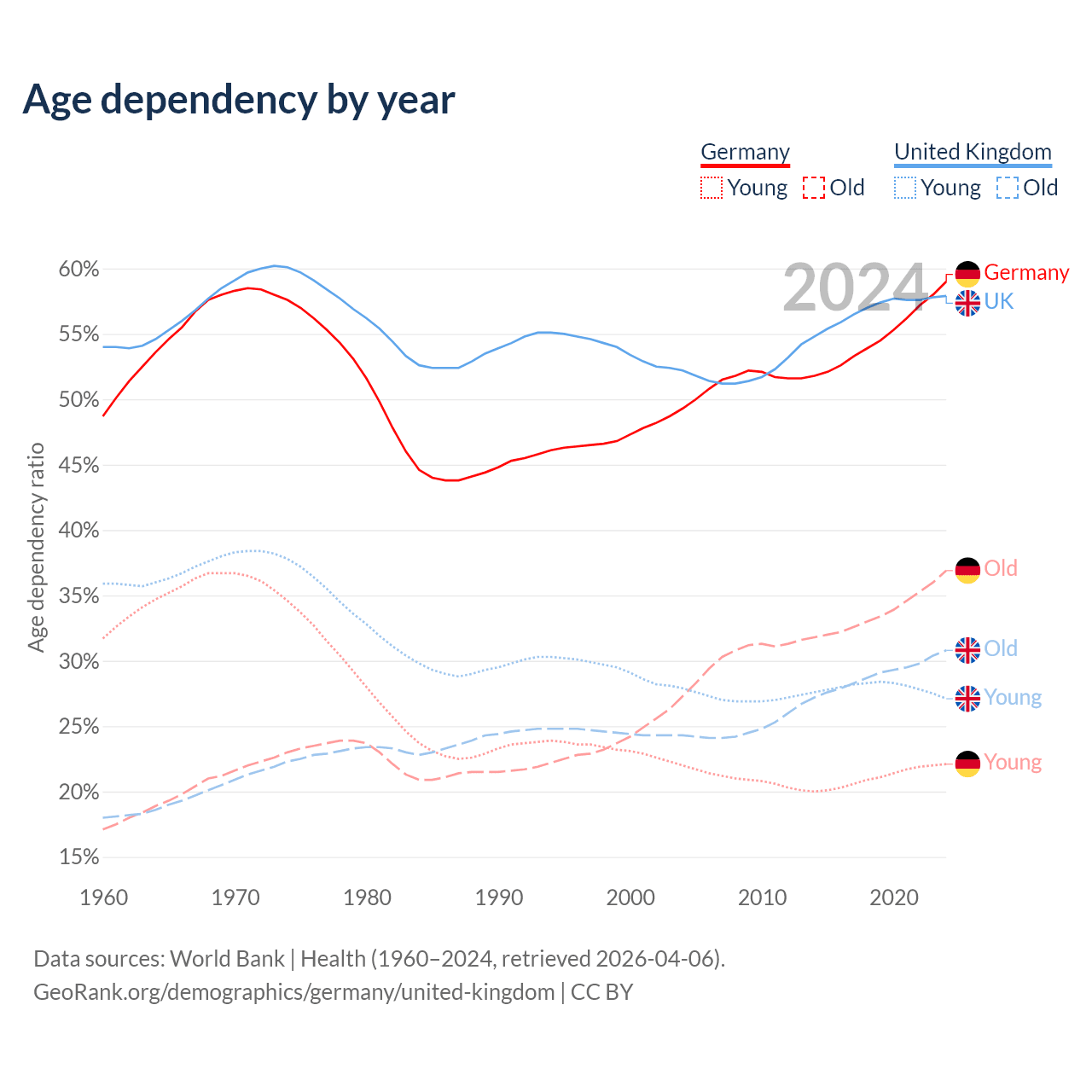 - Germany is ranked 9/196 by median age (oldest to youngest) vs 41/196 for the United Kingdom.