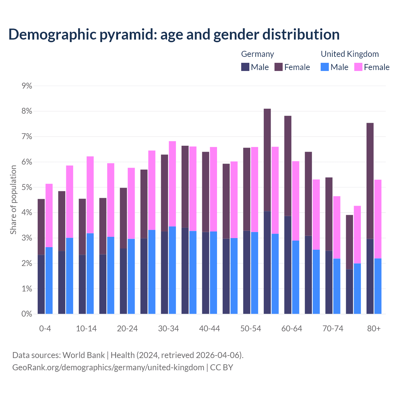 - As of 2026, the population of Germany is 82.6M vs 70.2M in the United Kingdom.