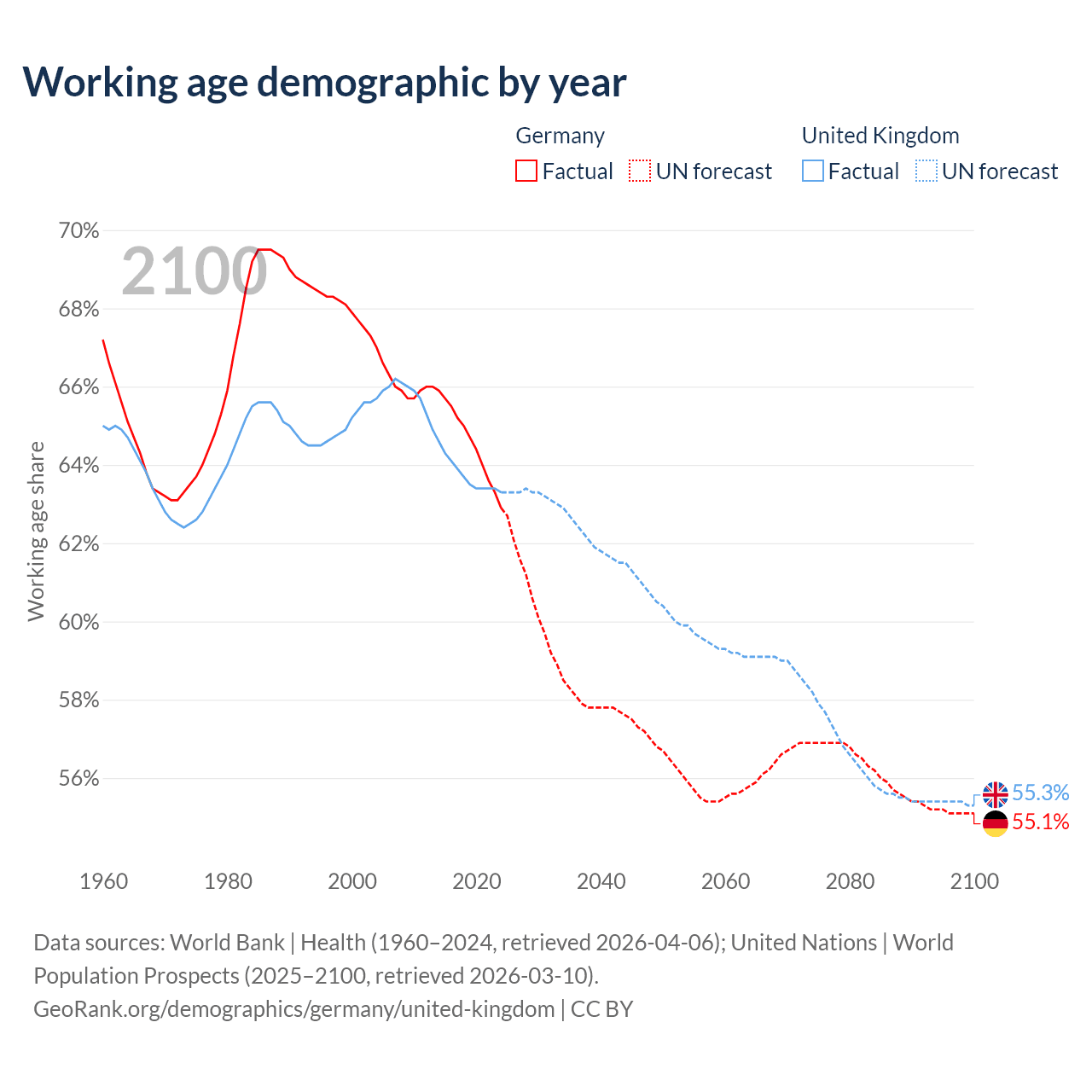 - Germany has 51.9M working age adults (aged 15-64) vs 44.4M in the United Kingdom.