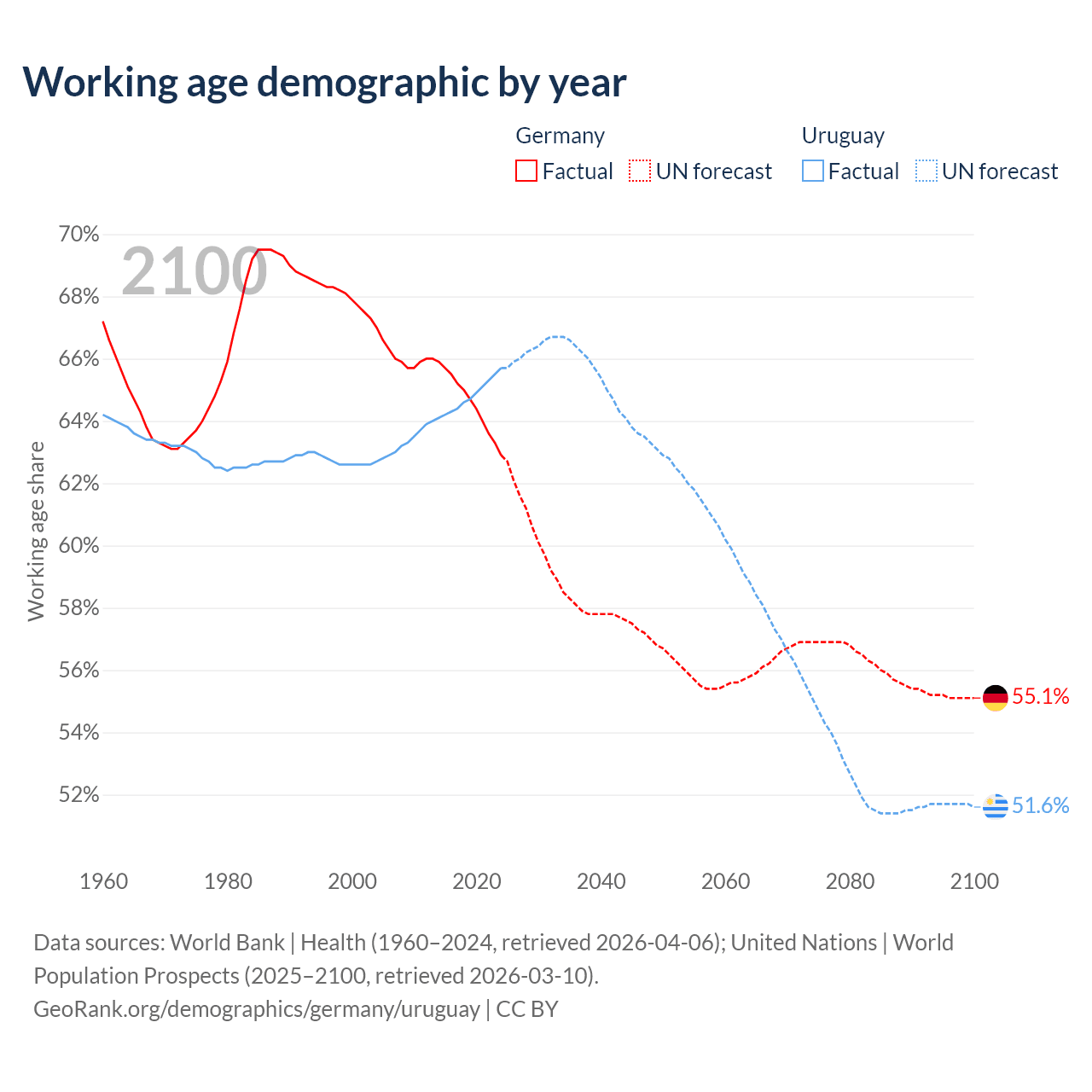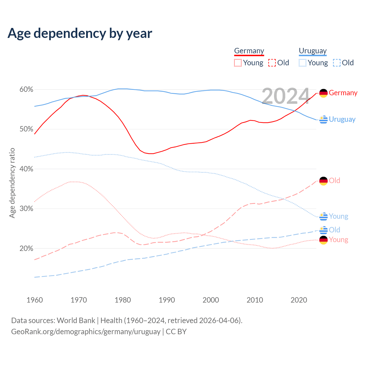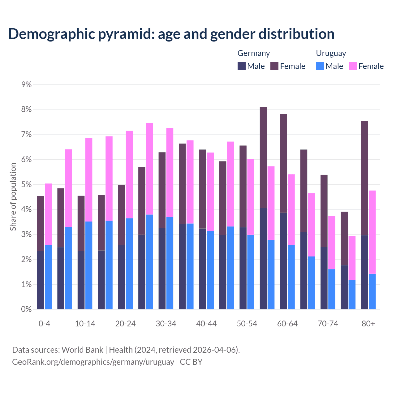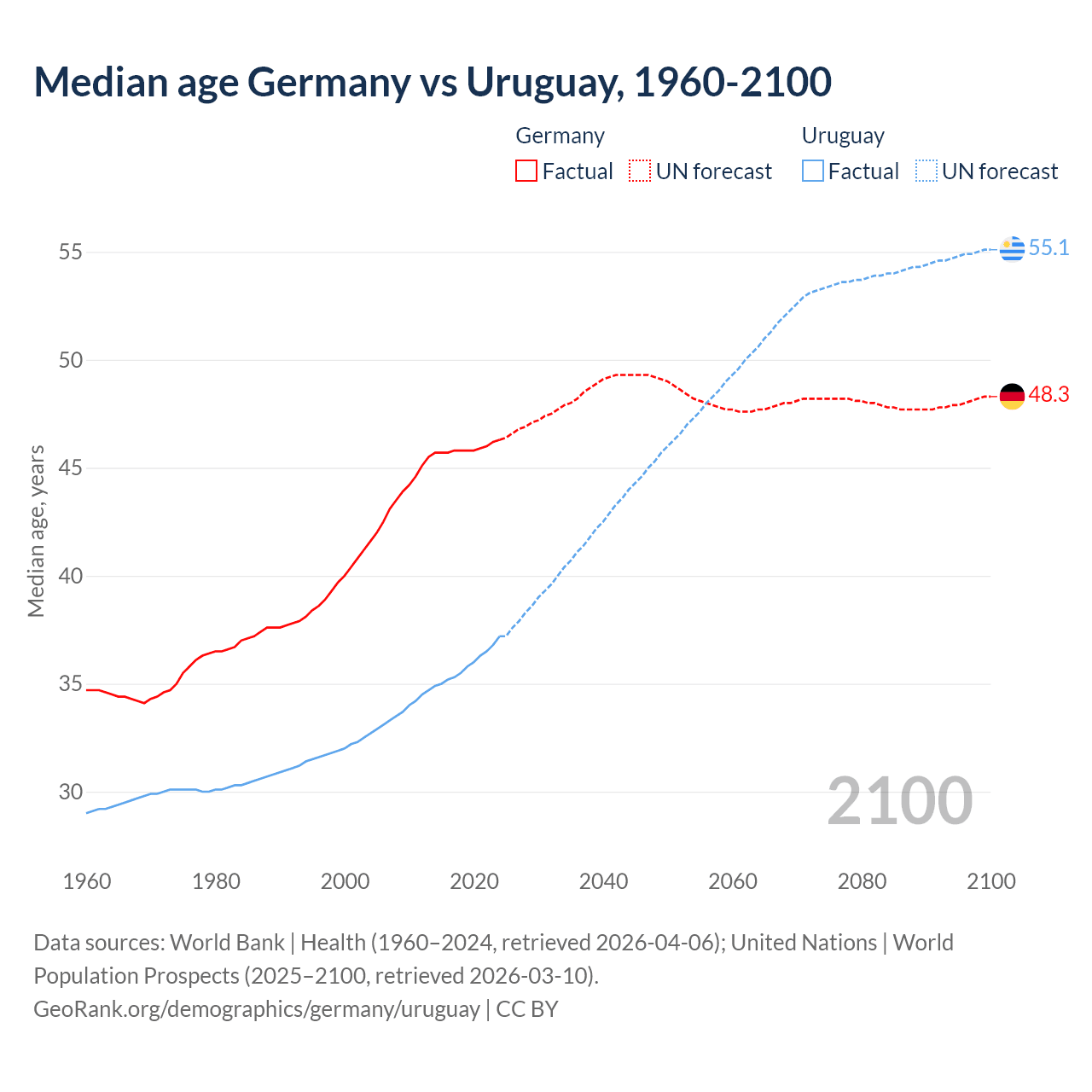 - Germany is ranked 9/196 by median age (oldest to youngest) vs 63/196 for Uruguay.