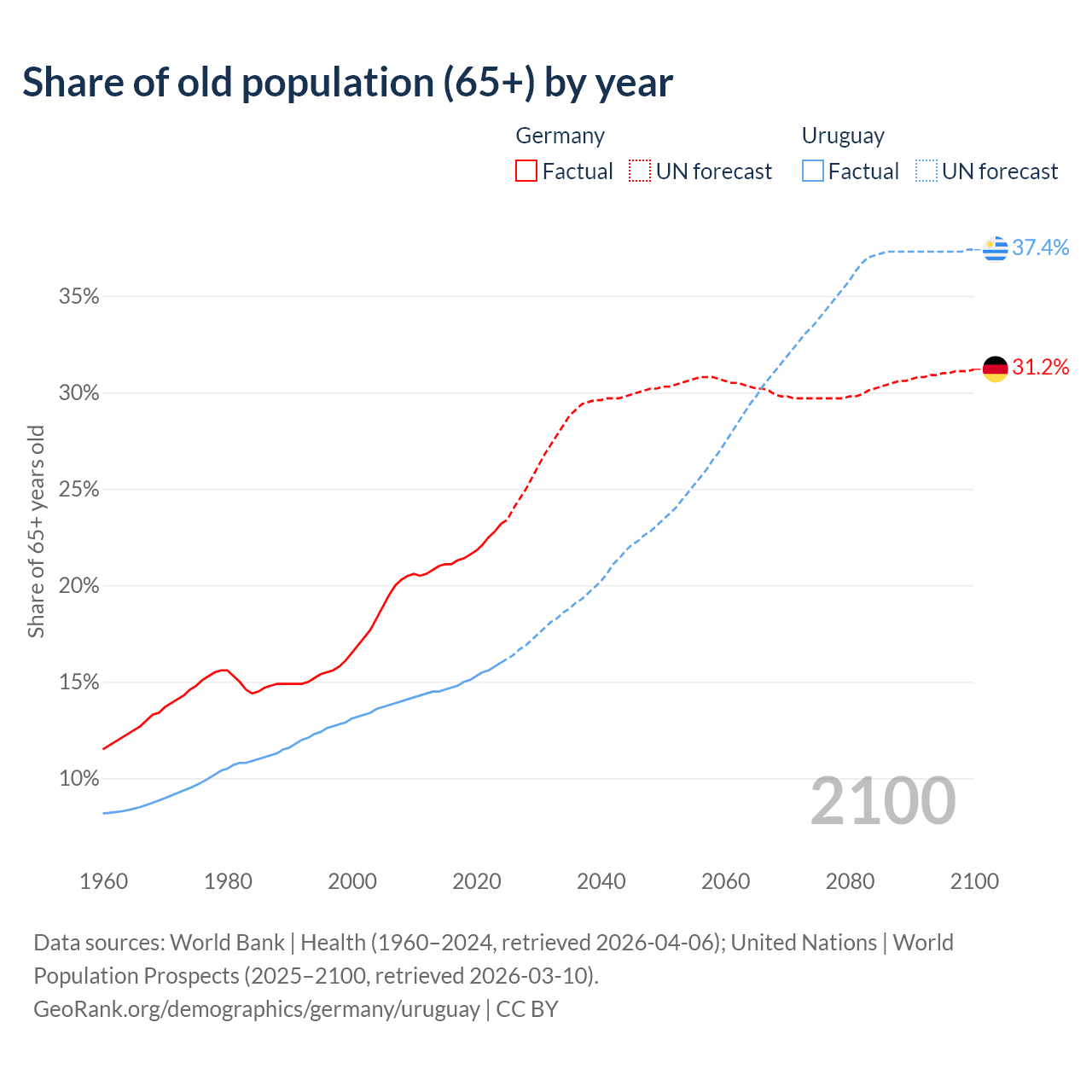The share of older people aged 65 and over is 23.2% in Germany and 16% in Uruguay. Life expectancy in Germany compared to Uruguay .