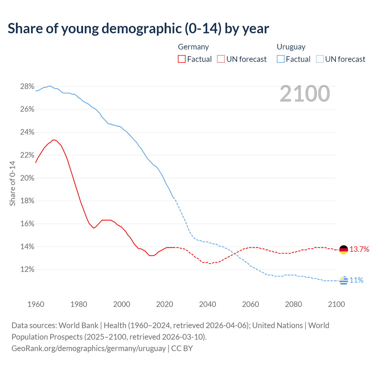 - The share of young demographic (0-15 years old) in Germany is 13.9% vs 18.3% in Uruguay.