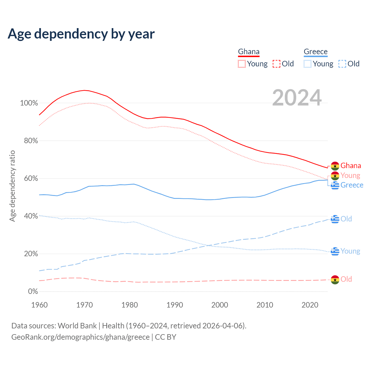 - Ghana is ranked 146/196 by median age (oldest to youngest) vs 6/196 for Greece.