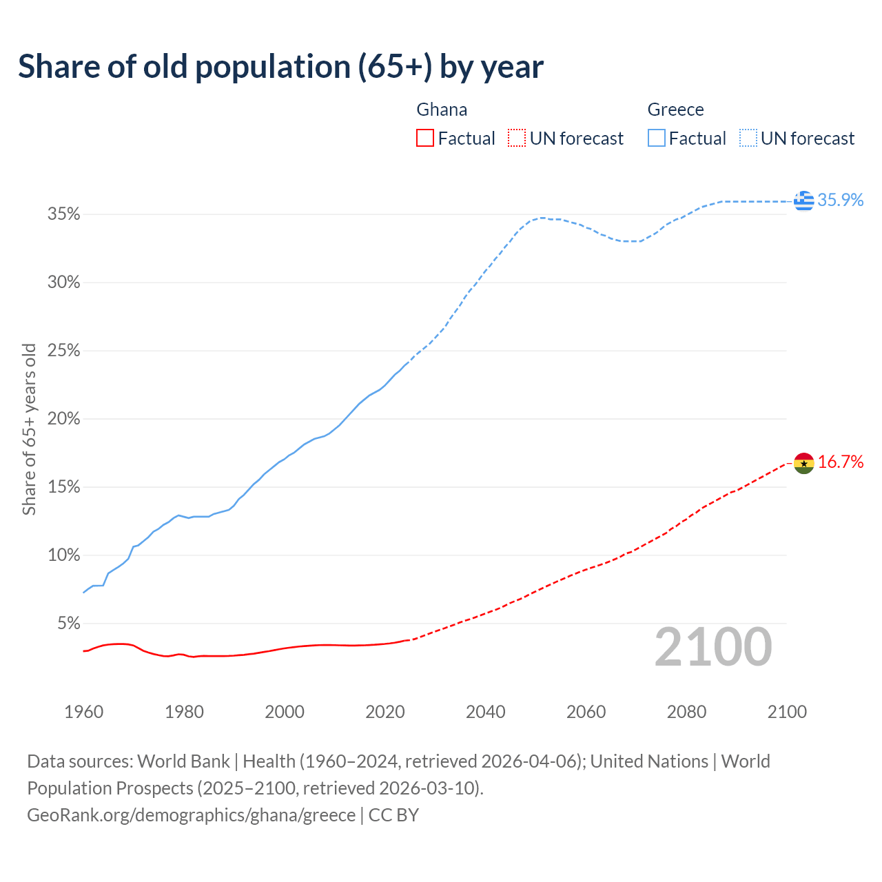 The share of older people aged 65 and over is 3.71% in Ghana and 23.9% in Greece. Life expectancy in Ghana compared to Greece .