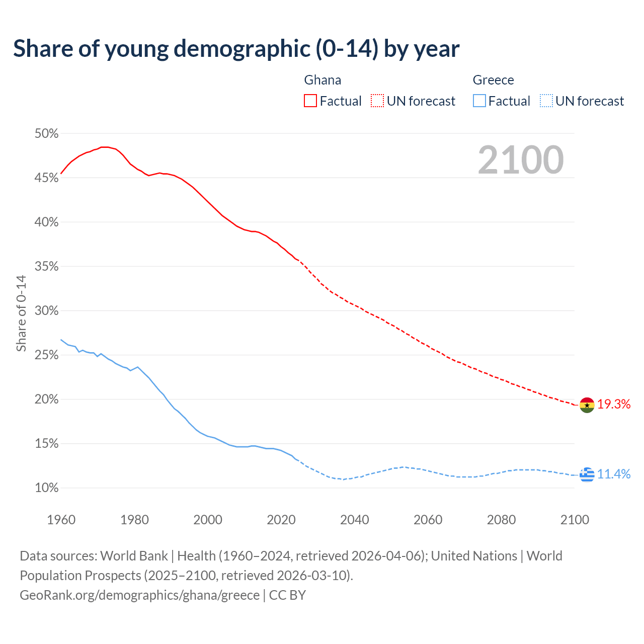 - The share of young demographic (0-15 years old) in Ghana is 35.8% vs 13.2% in Greece.