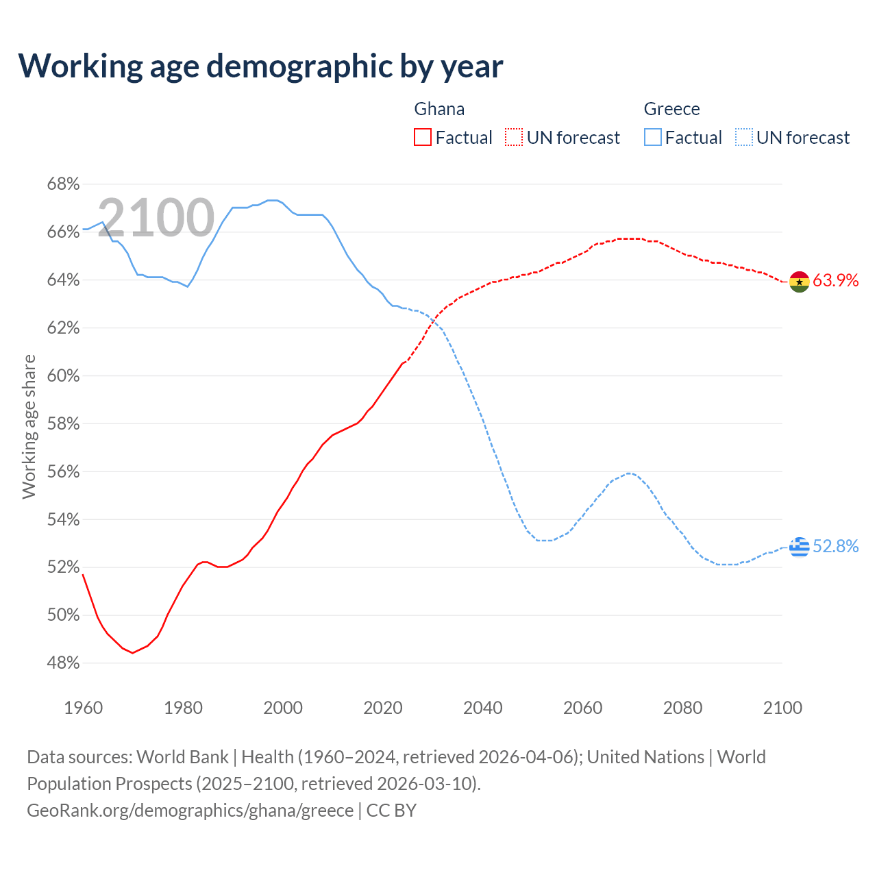 - Ghana has 21.7M working age adults (aged 15-64) vs 6.4M in Greece.