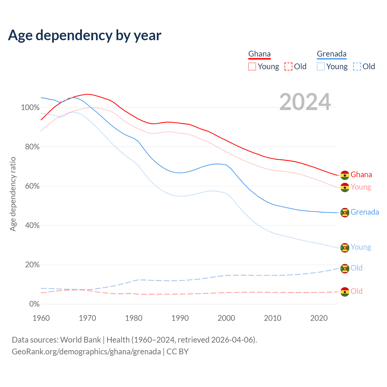 The share of older people aged 65 and over is 3.71% in Ghana and 12.2% in Grenada. Life expectancy in Ghana compared to Grenada .