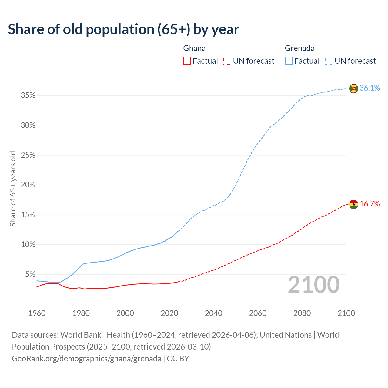 - The share of old-age demographic (65+) in Ghana is 3.71% vs 12.2% in Grenada.