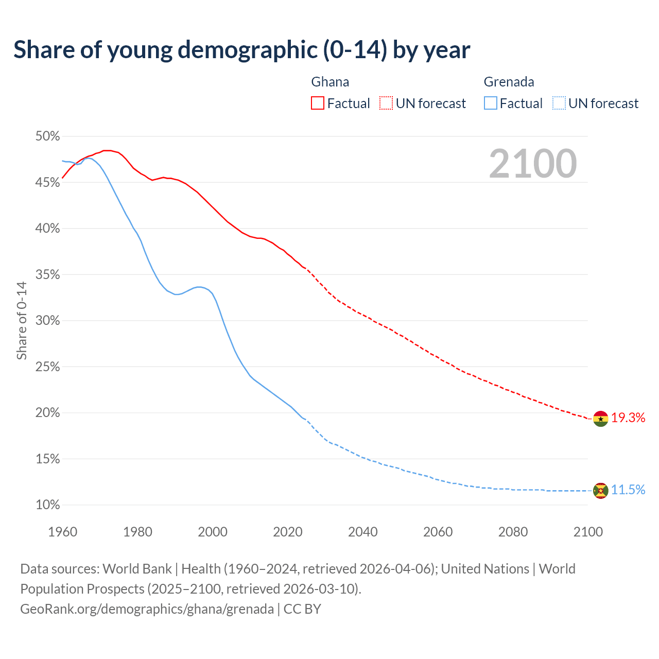 - The share of young demographic (0-15 years old) in Ghana is 35.8% vs 19.4% in Grenada.