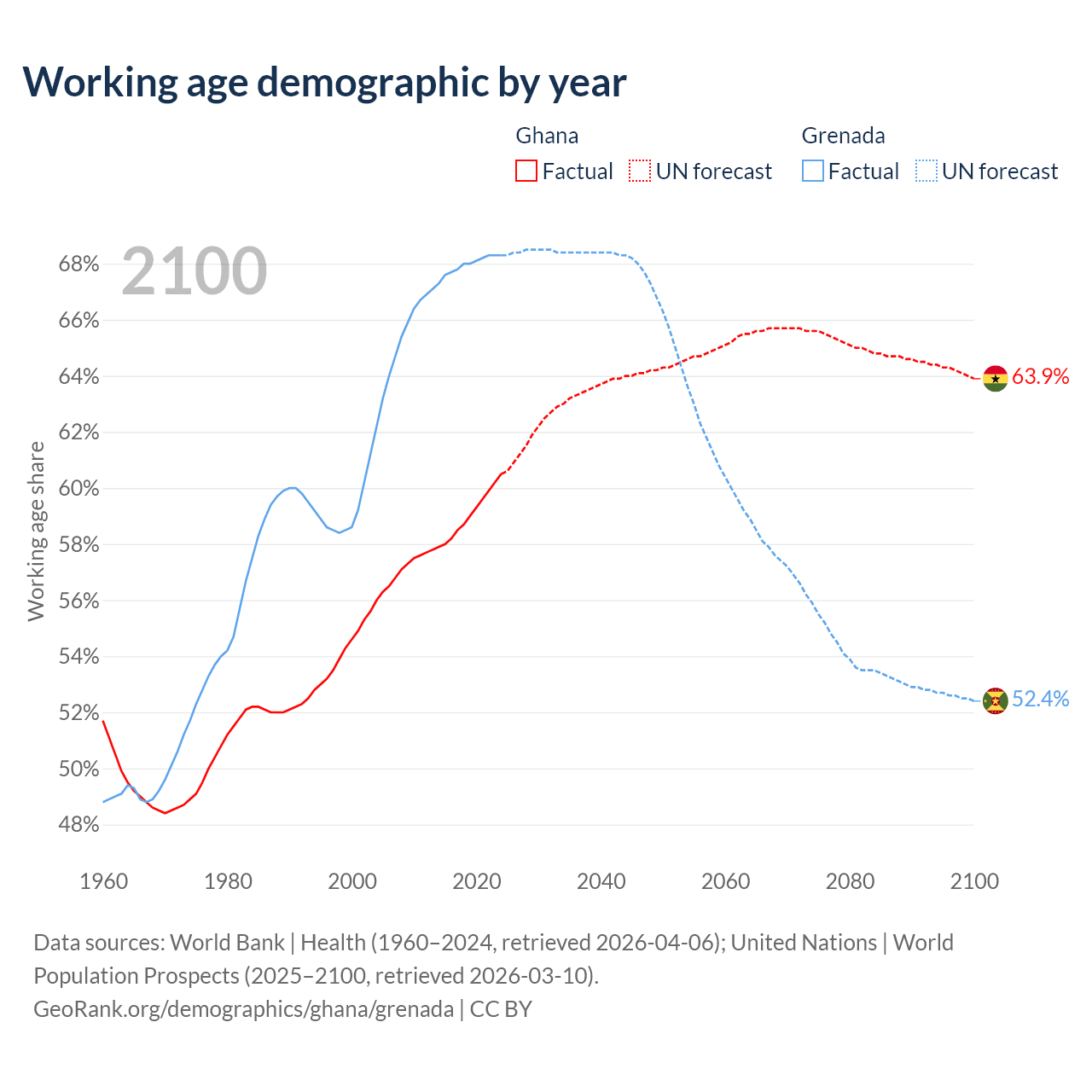 - Ghana has 21.7M working age adults (aged 15-64) vs 80.2K in Grenada.