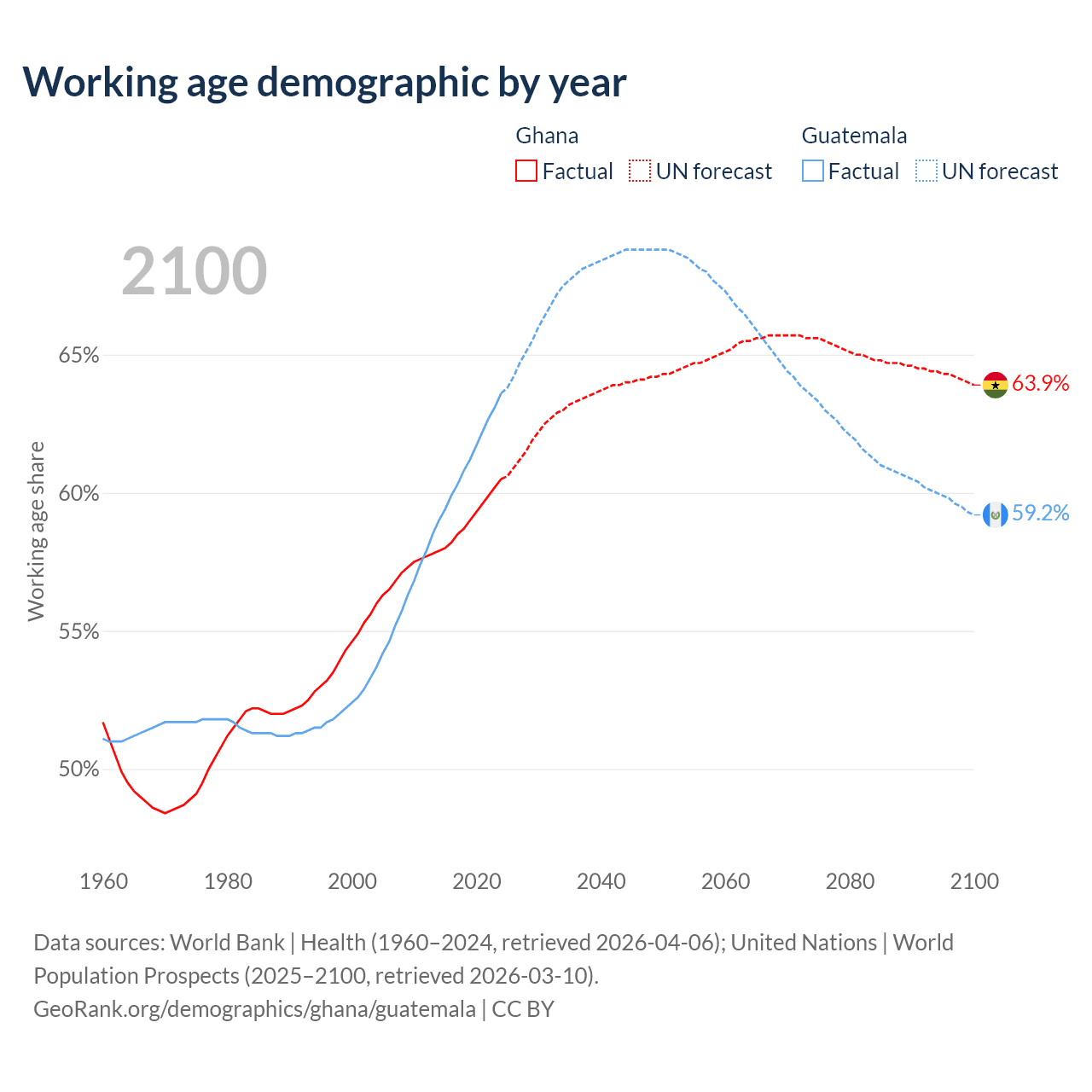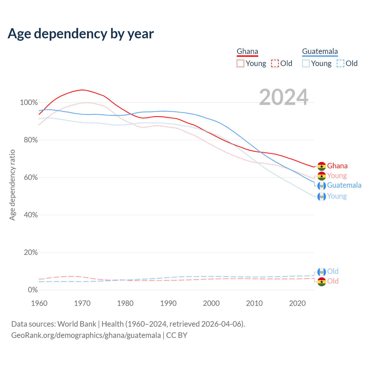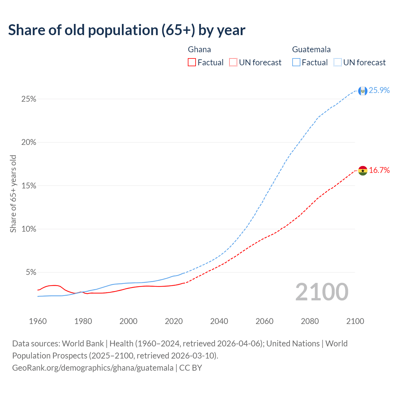 The share of older people aged 65 and over is 3.71% in Ghana and 4.85% in Guatemala. Life expectancy in Ghana compared to Guatemala .