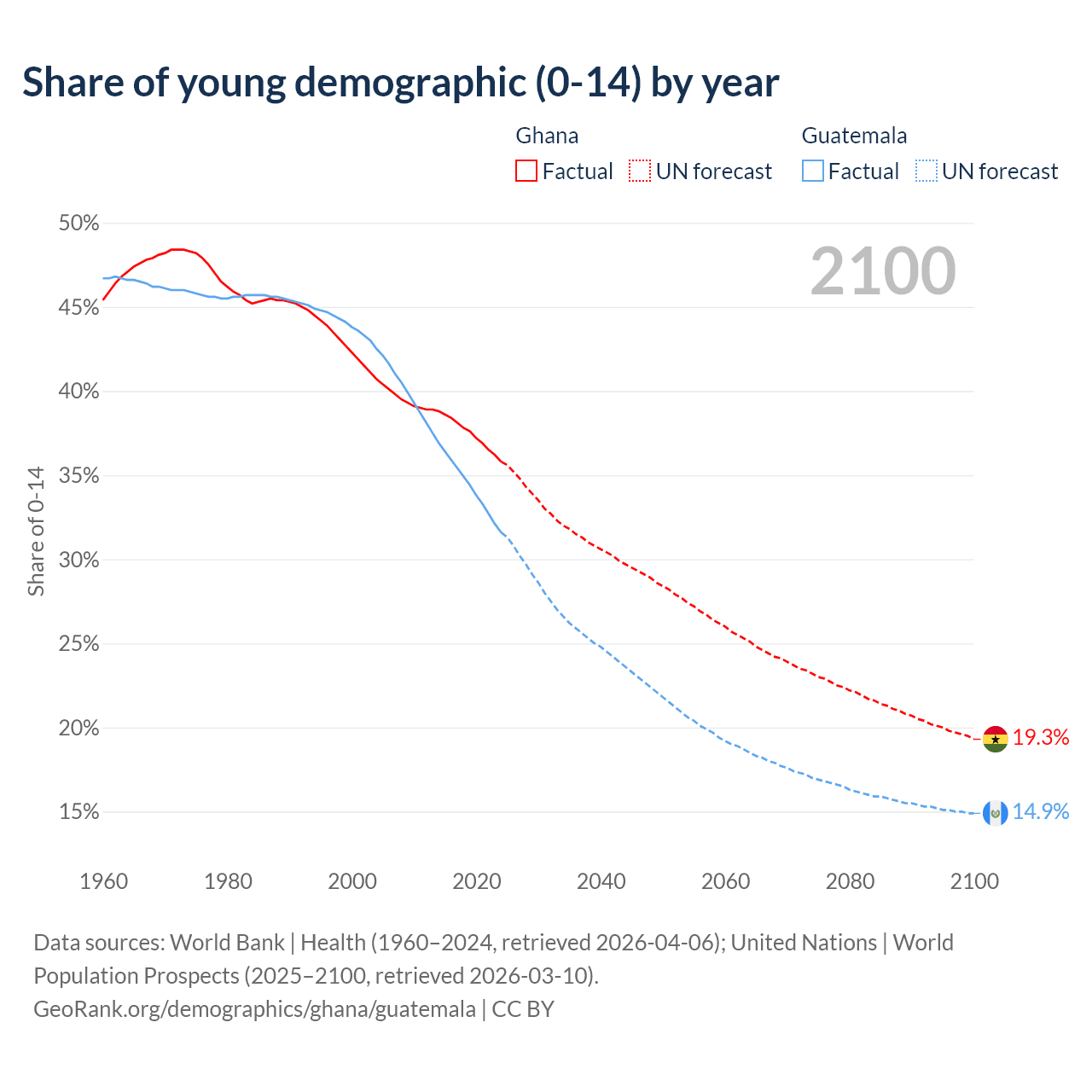 - The share of young demographic (0-15 years old) in Ghana is 35.8% vs 31.6% in Guatemala.