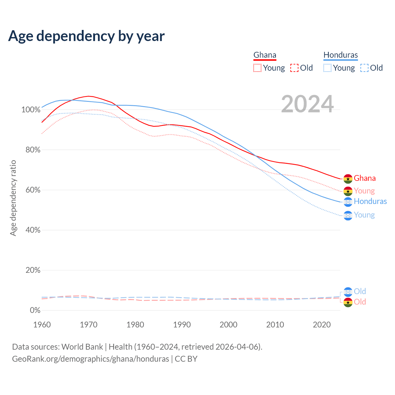 The share of older people aged 65 and over is 3.71% in Ghana and 4.42% in Honduras. Life expectancy in Ghana compared to Honduras .