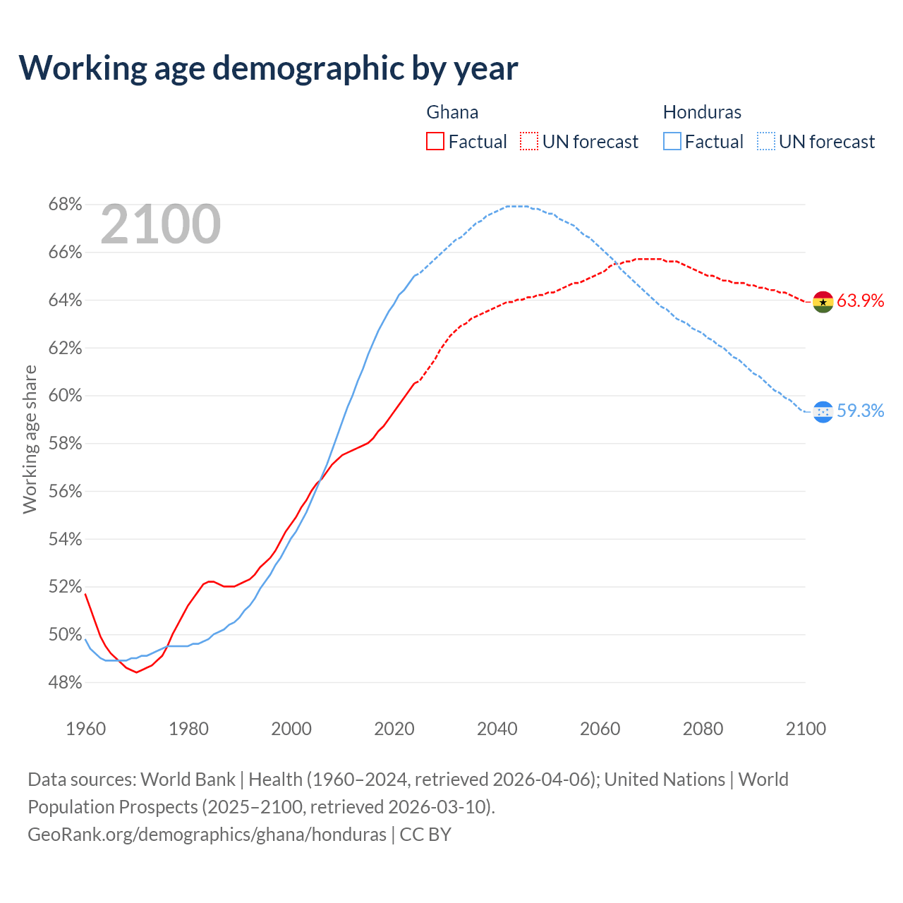 - Ghana has 21.7M working age adults (aged 15-64) vs 7.3M in Honduras.