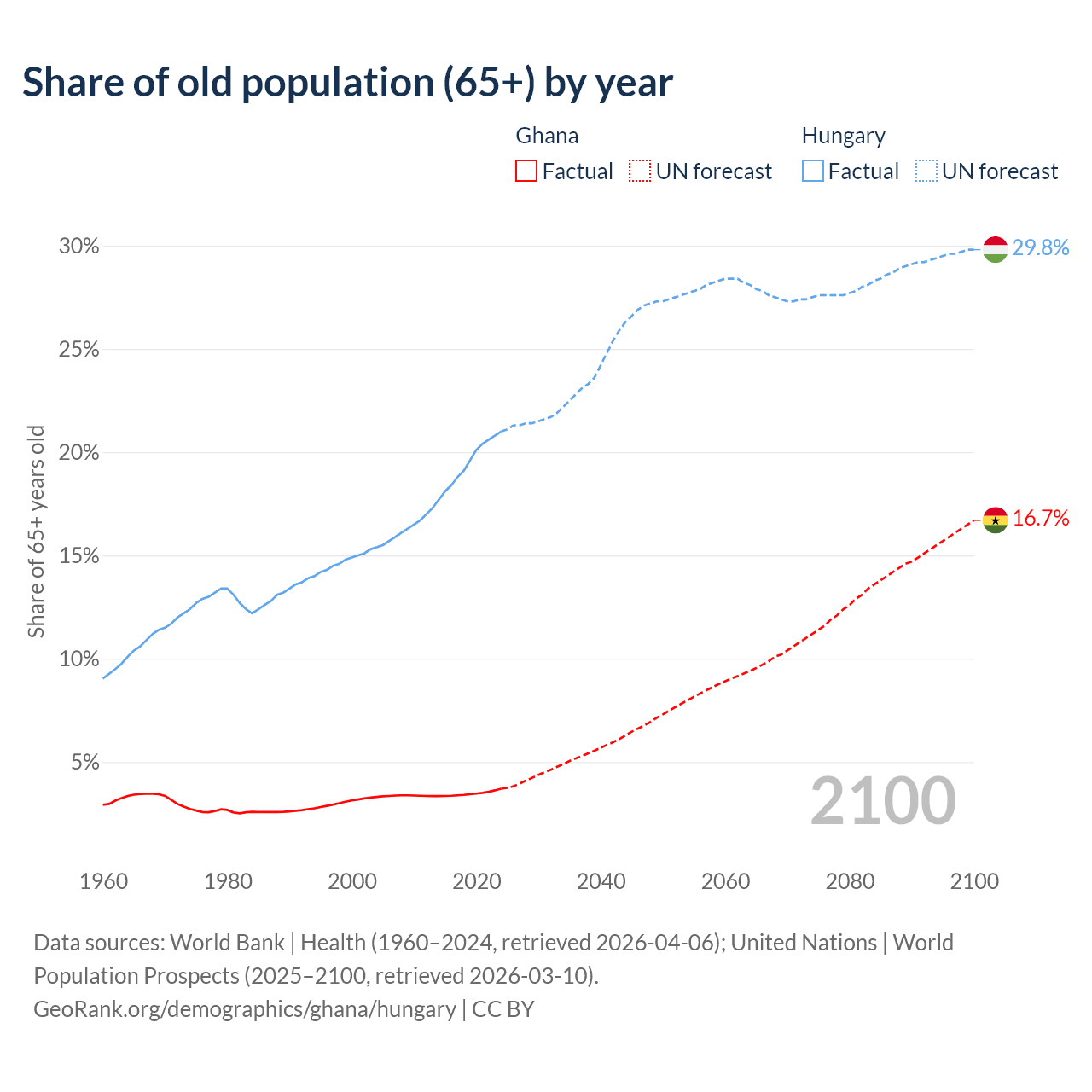 The share of older people aged 65 and over is 3.71% in Ghana and 21% in Hungary. Life expectancy in Ghana compared to Hungary .