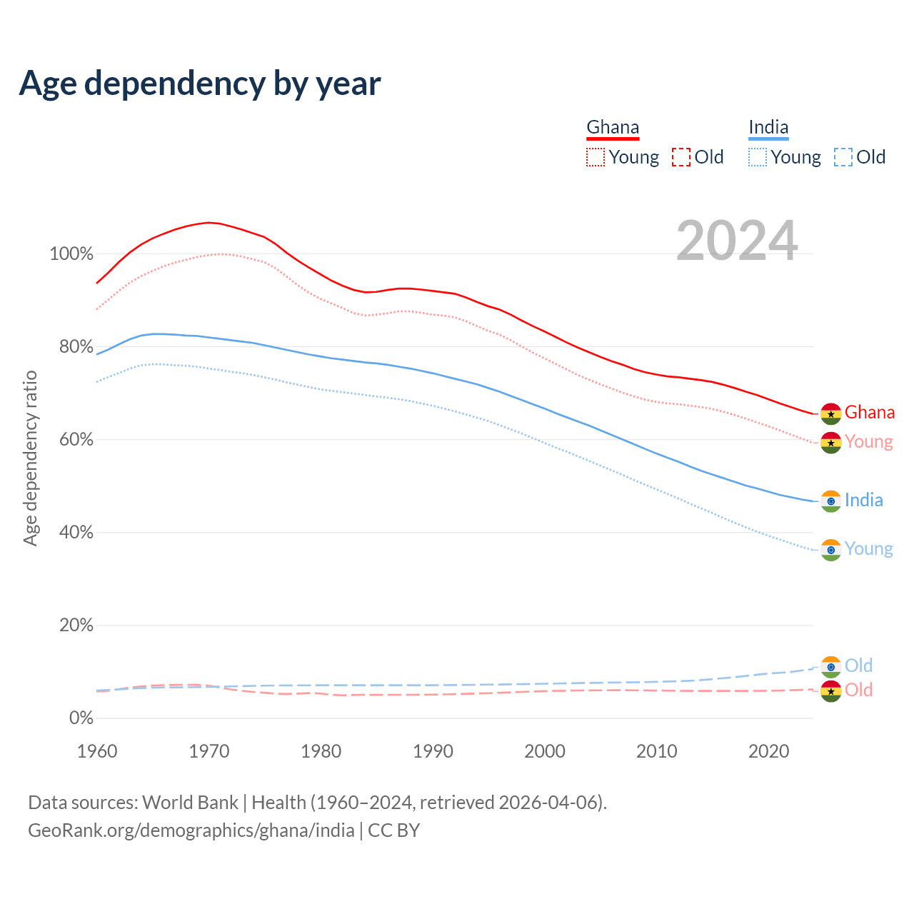 - Ghana is ranked 146/196 by median age (oldest to youngest) vs 108/196 for India.