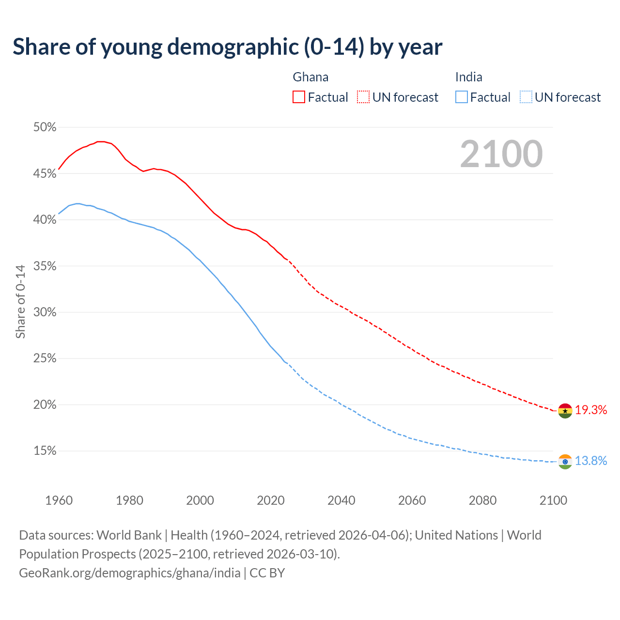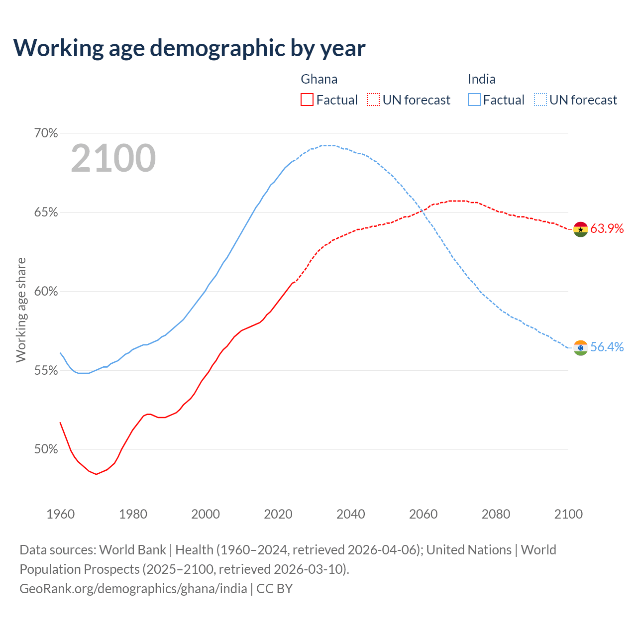 Median age Ghana vs India, 1960-2100