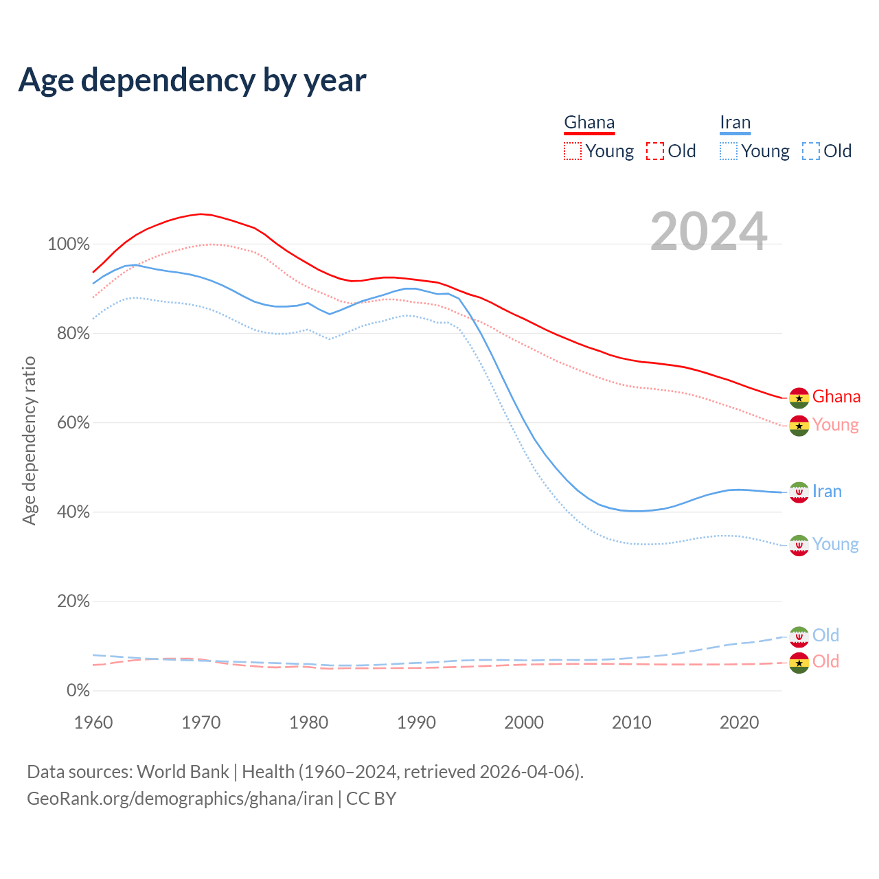The share of older people aged 65 and over is 3.71% in Ghana and 8.24% in Iran. Life expectancy in Ghana compared to Iran .