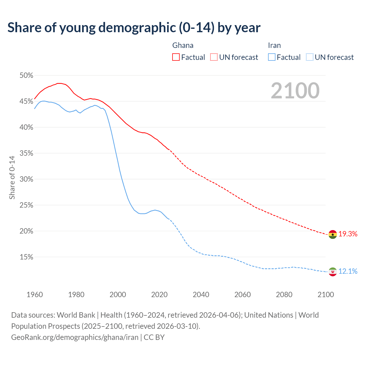 - The share of young demographic (0-15 years old) in Ghana is 35.8% vs 22.4% in Iran.