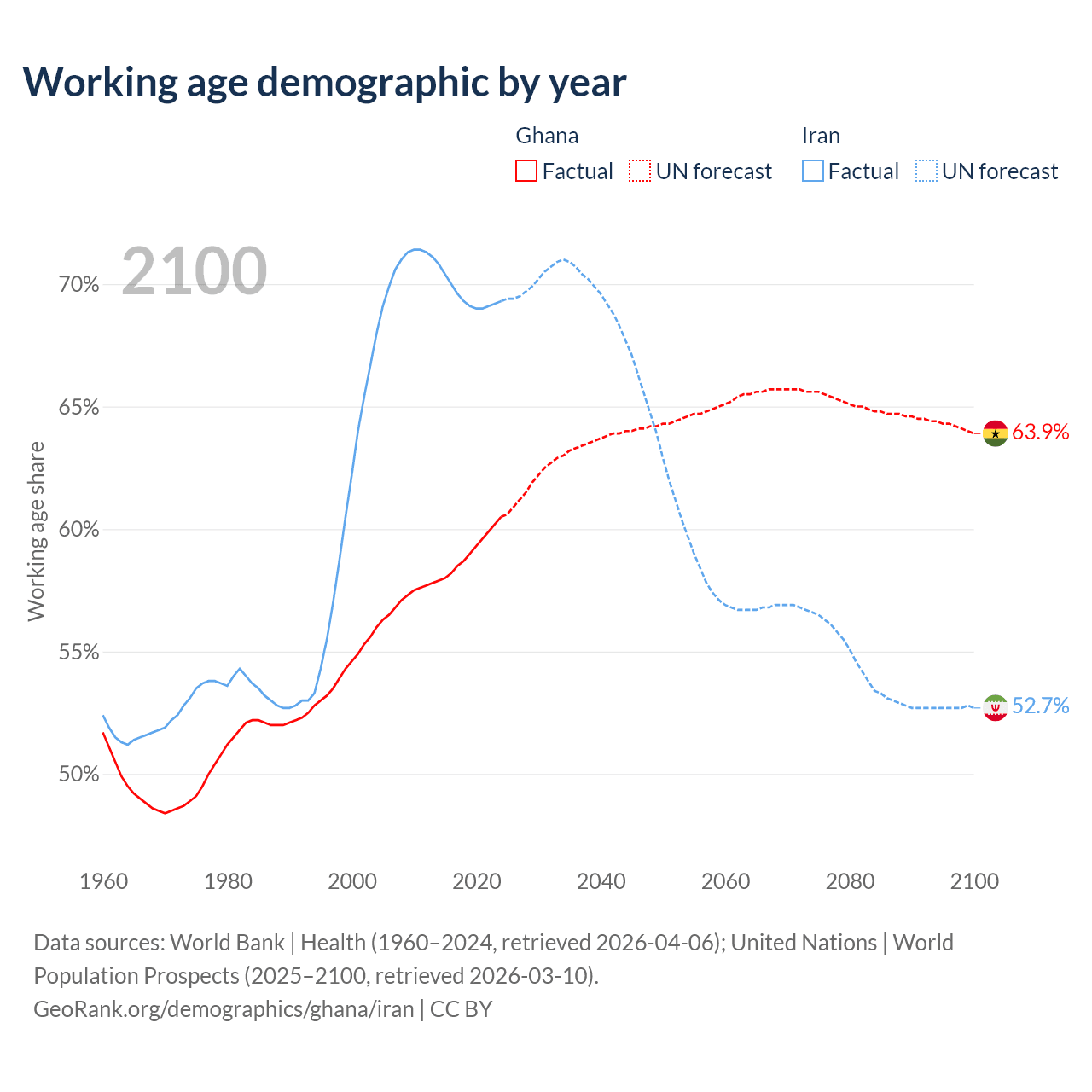 - Ghana has 21.7M working age adults (aged 15-64) vs 64.8M in Iran.