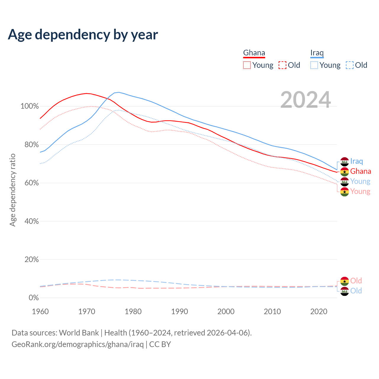 - Ghana is ranked 146/196 by median age (oldest to youngest) vs 151/196 for Iraq.