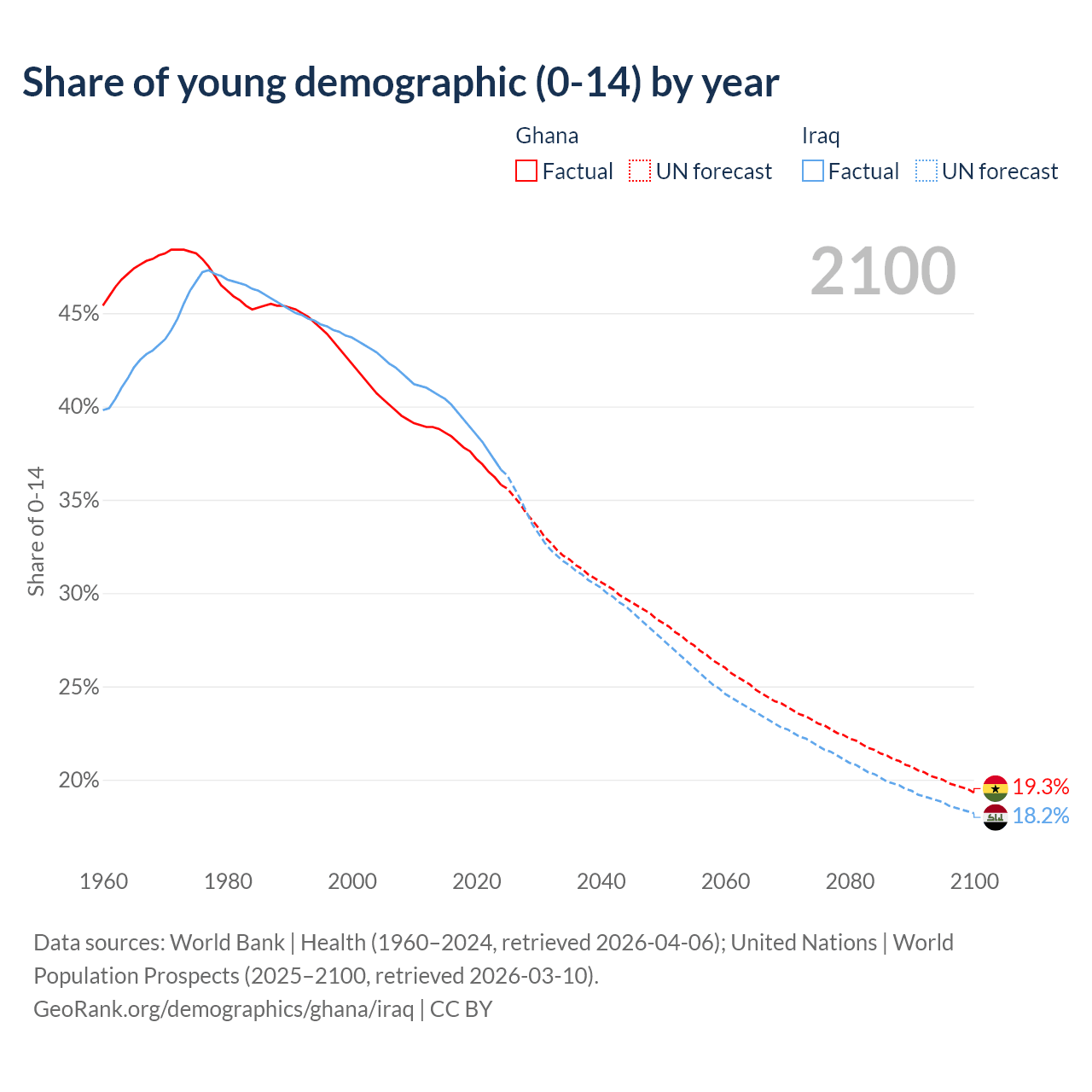 - The share of young demographic (0-15 years old) in Ghana is 35.8% vs 36.6% in Iraq.