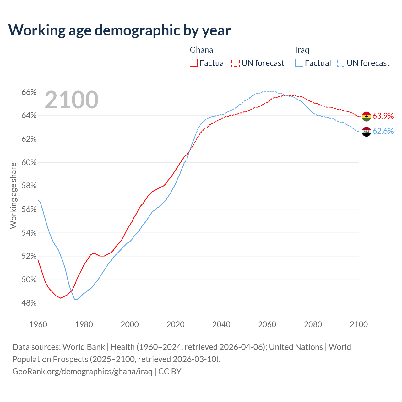 - Ghana has 21.7M working age adults (aged 15-64) vs 29M in Iraq.