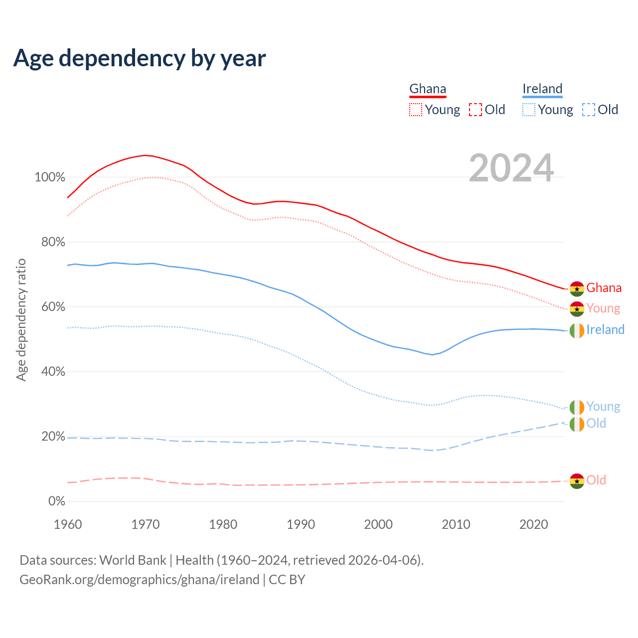 The share of older people aged 65 and over is 3.71% in Ghana and 15.9% in Ireland. Life expectancy in Ghana compared to Ireland .