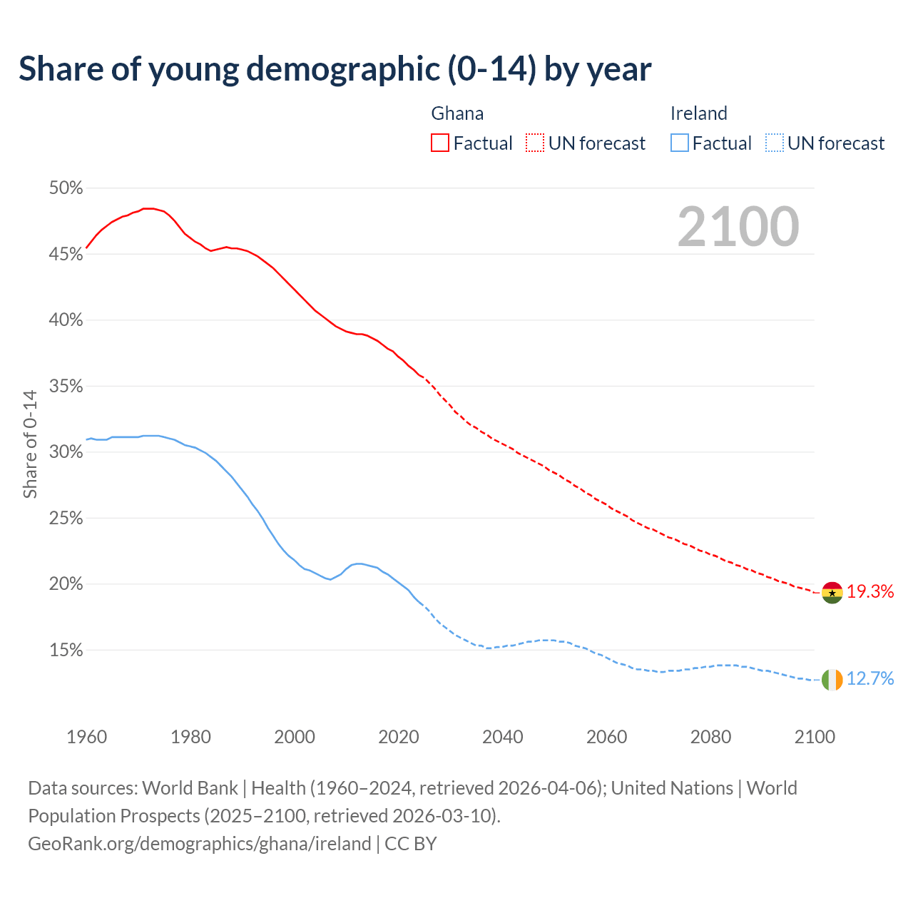 - The share of young demographic (0-15 years old) in Ghana is 35.8% vs 18.6% in Ireland.