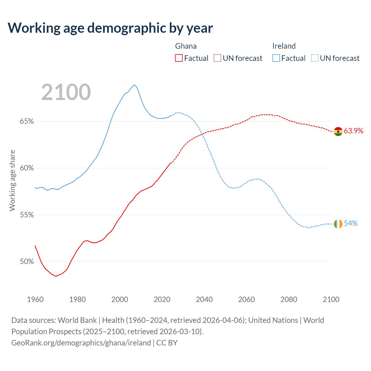 - Ghana has 21.7M working age adults (aged 15-64) vs 3.62M in Ireland.